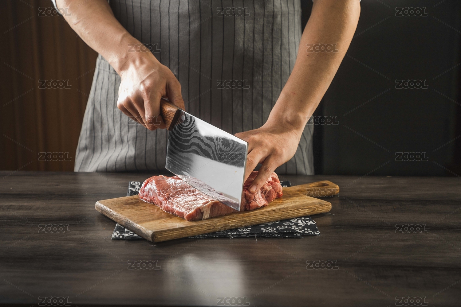 菜刀,砧板,切,瘦肉,牛肉,生肉,蓝色花布,围裙,暗色调,暗背景