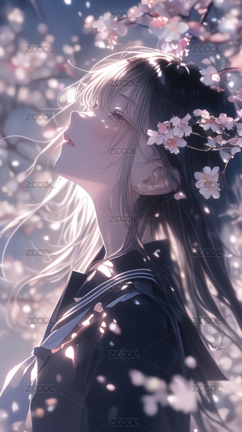 樱花树下长发少女的梦幻瞬间