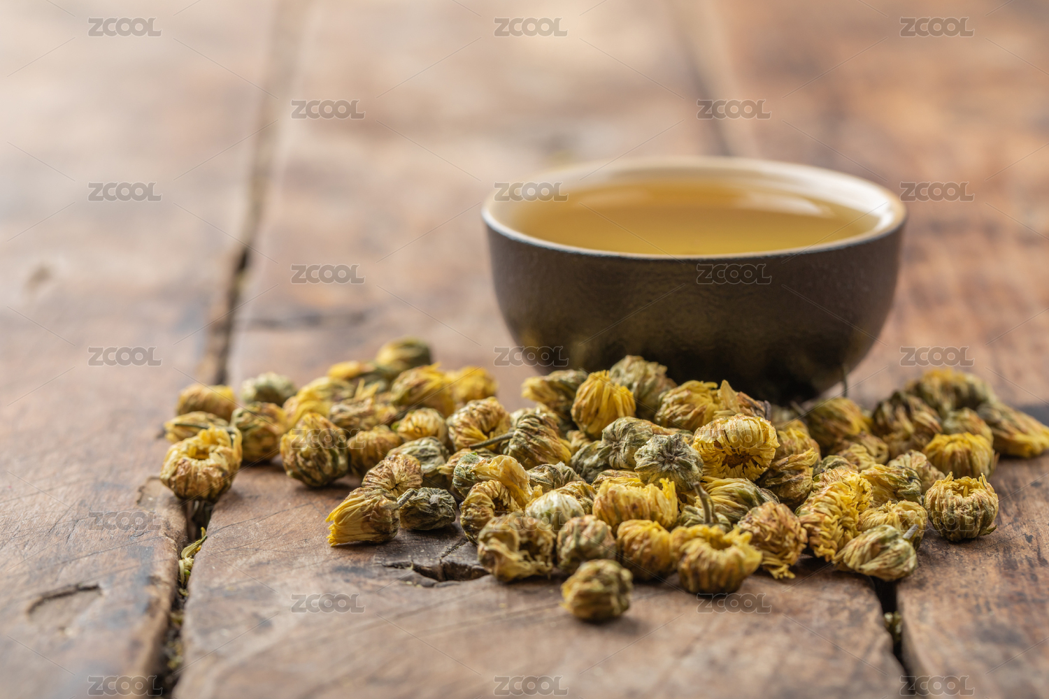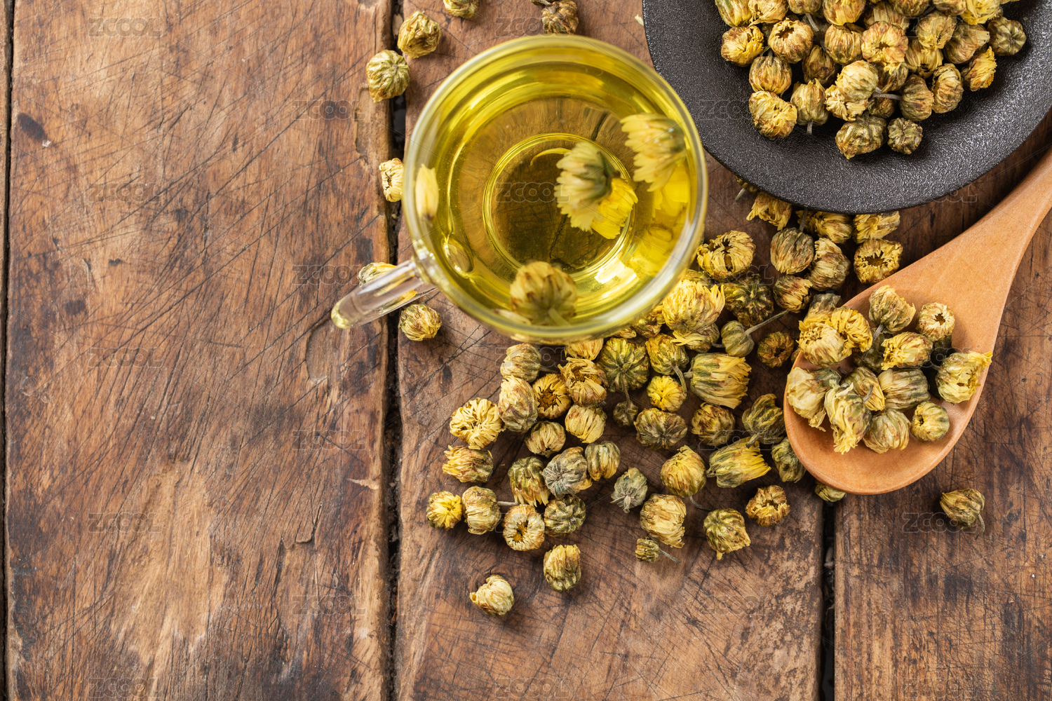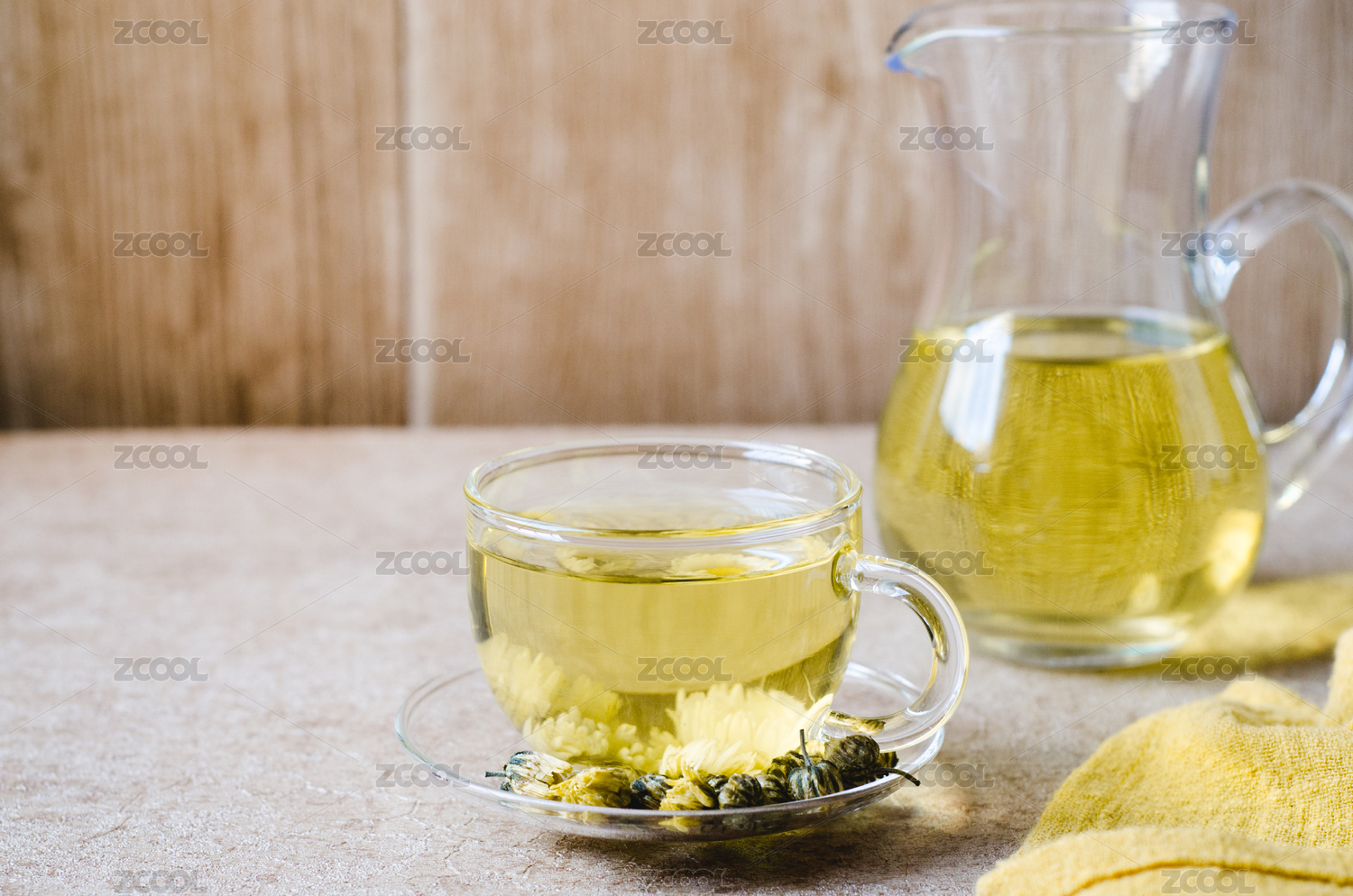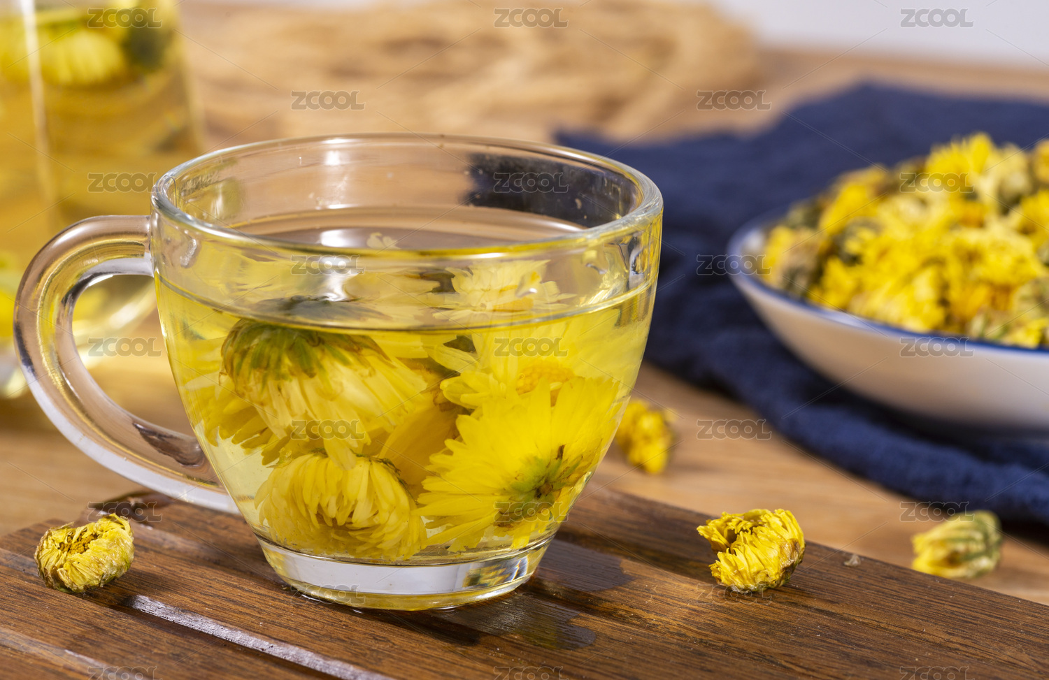 木制桌子上的菊花茶与茶具