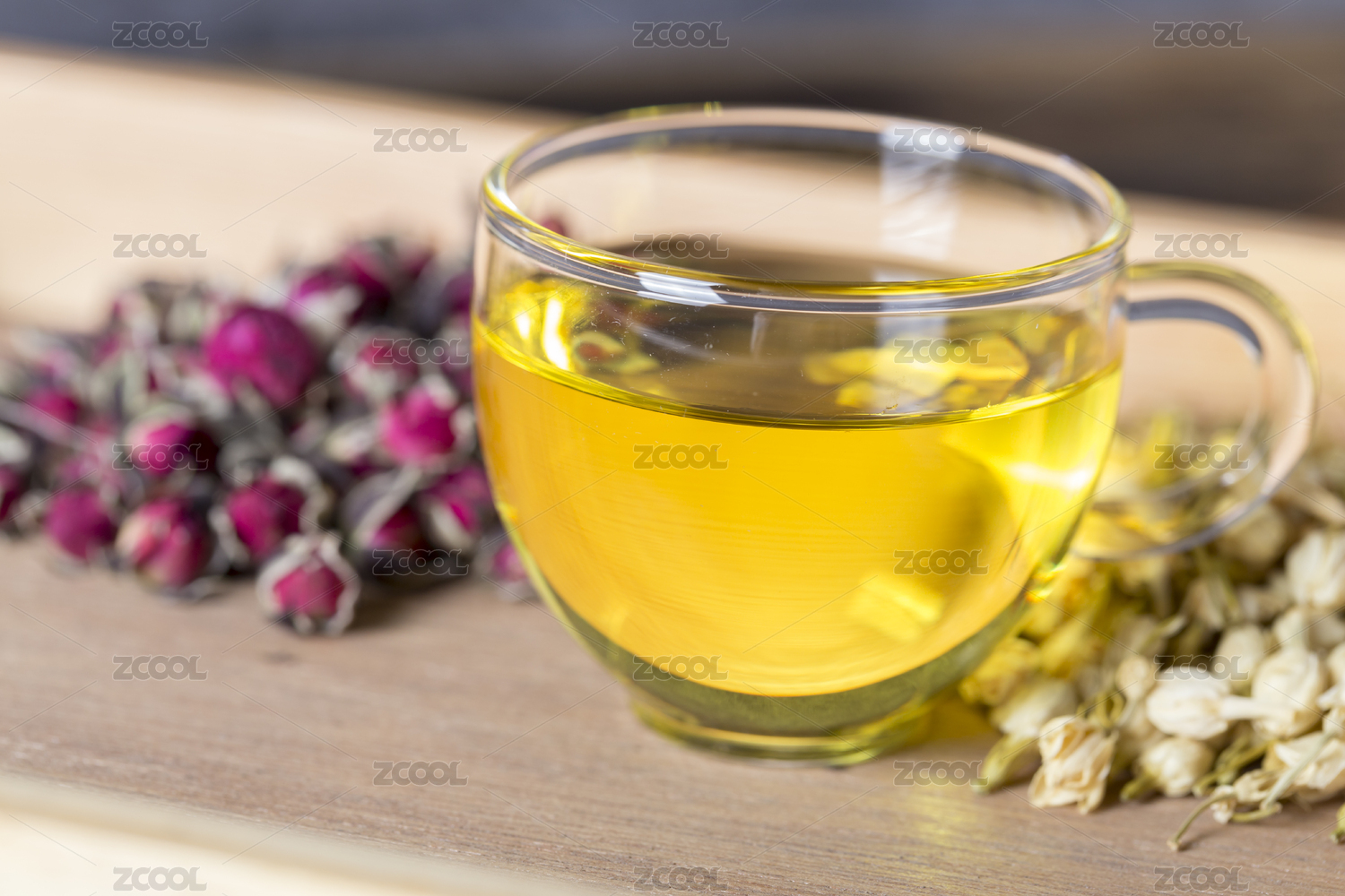 中国古典风格的多种健康花茶与茶杯特写