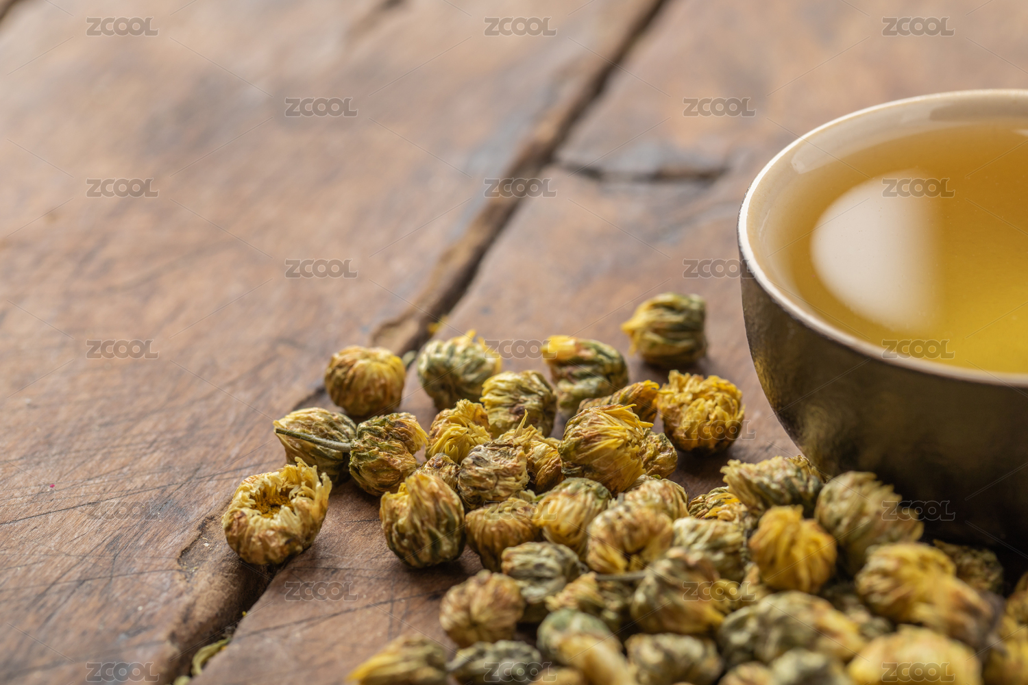 木质桌子上的胎菊菊花茶与茶具