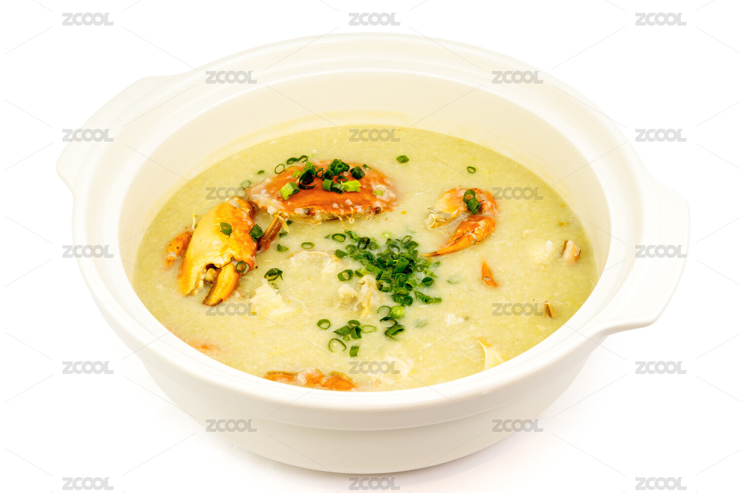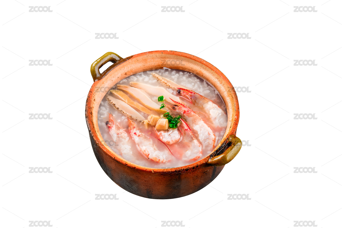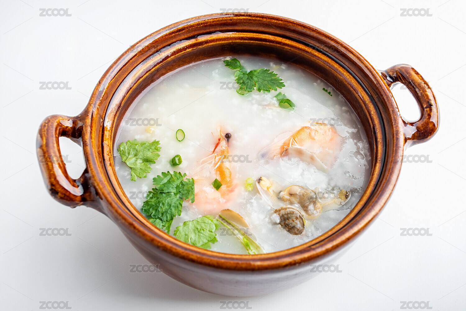 白色背景上白色打包盒中的鲜虾鱼片粥