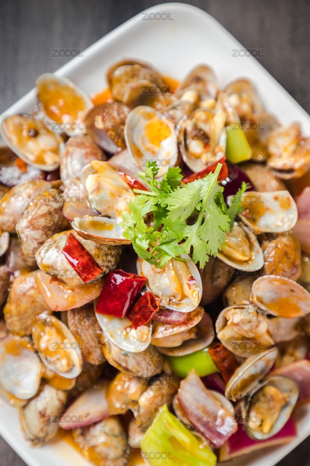 白色圆盘装的辣炒花蛤