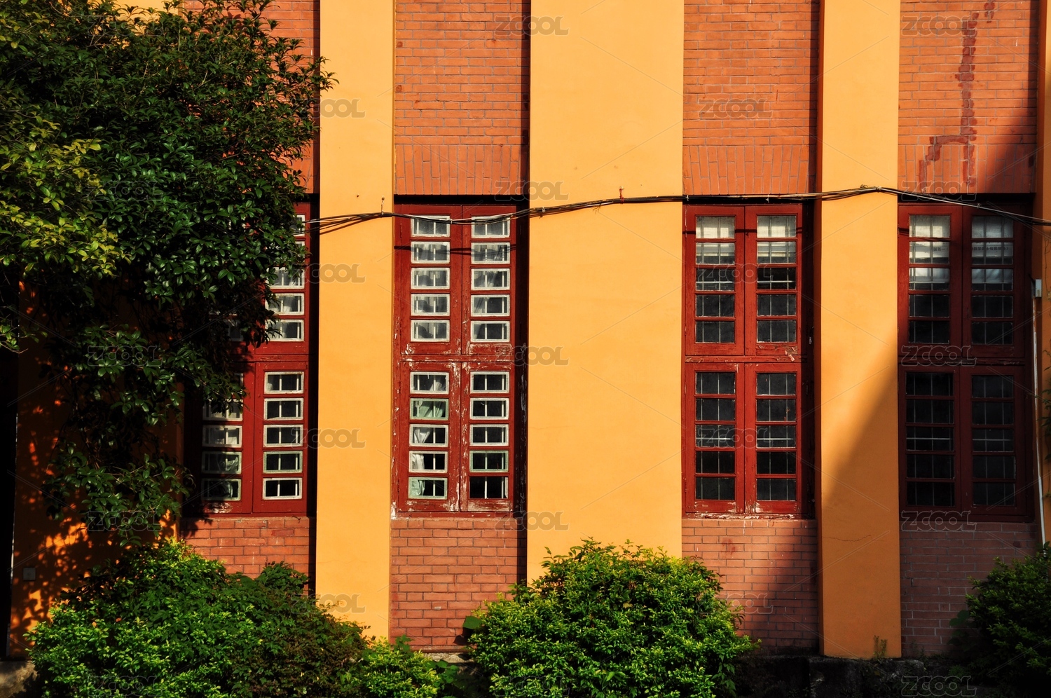 红砖墙上红色的木制窗户