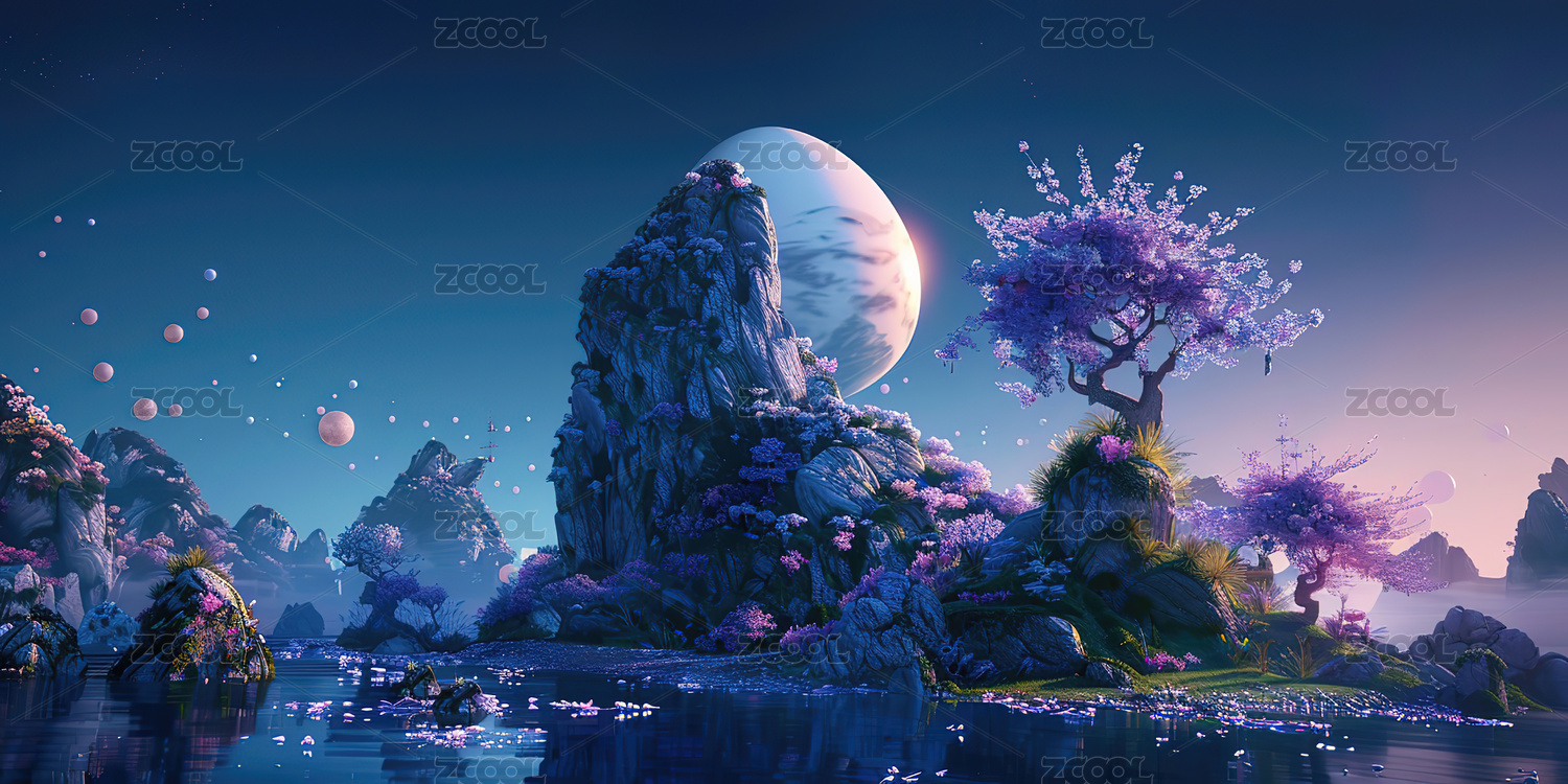 梦幻山水与古塔在月光下的奇幻景象