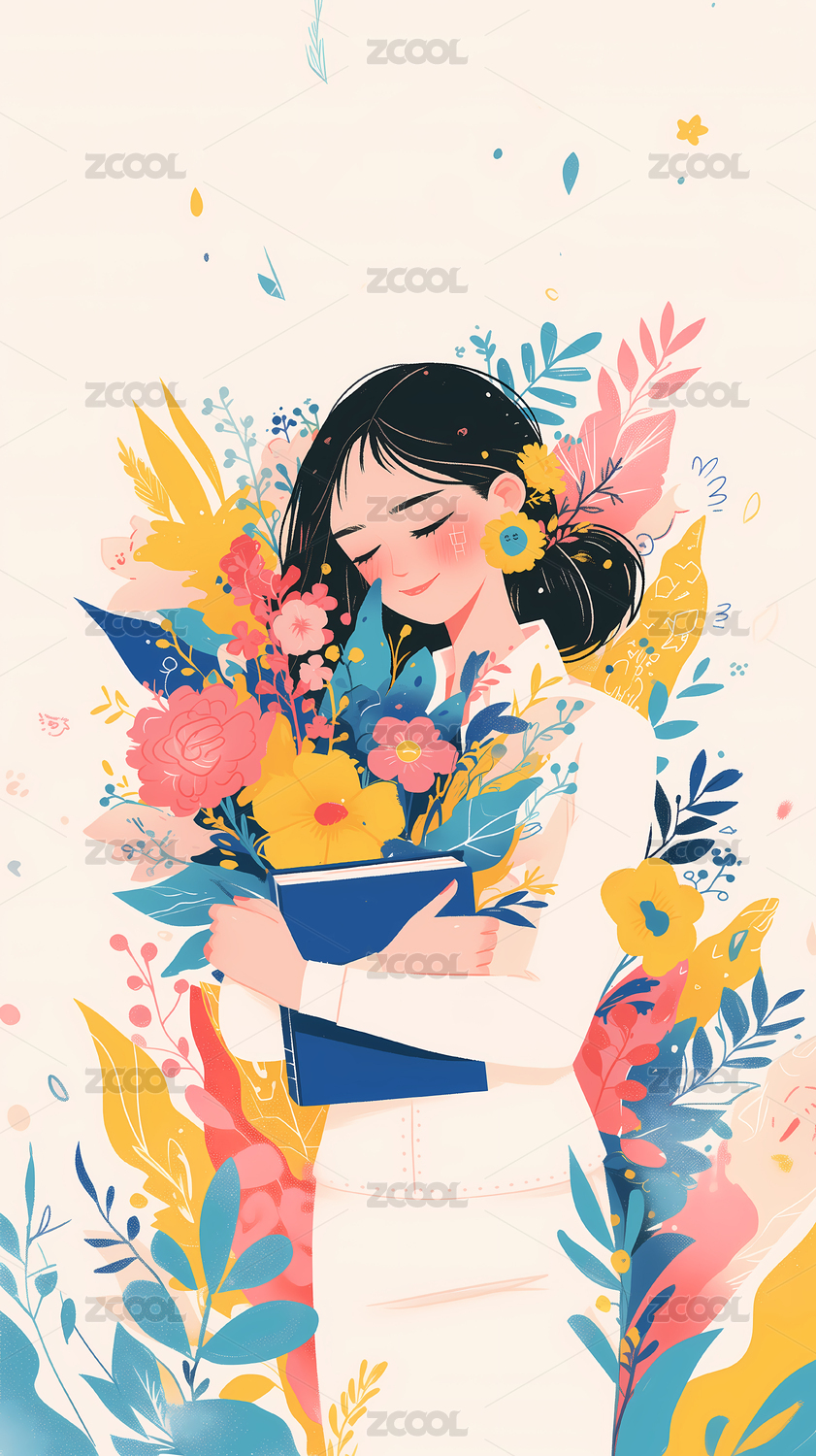 一位女性拿着书本鲜花教师节插画