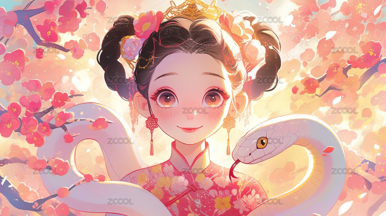 国潮风,蛇,蛇年,生肖蛇,美女,女人,女孩,人,人物,卡通