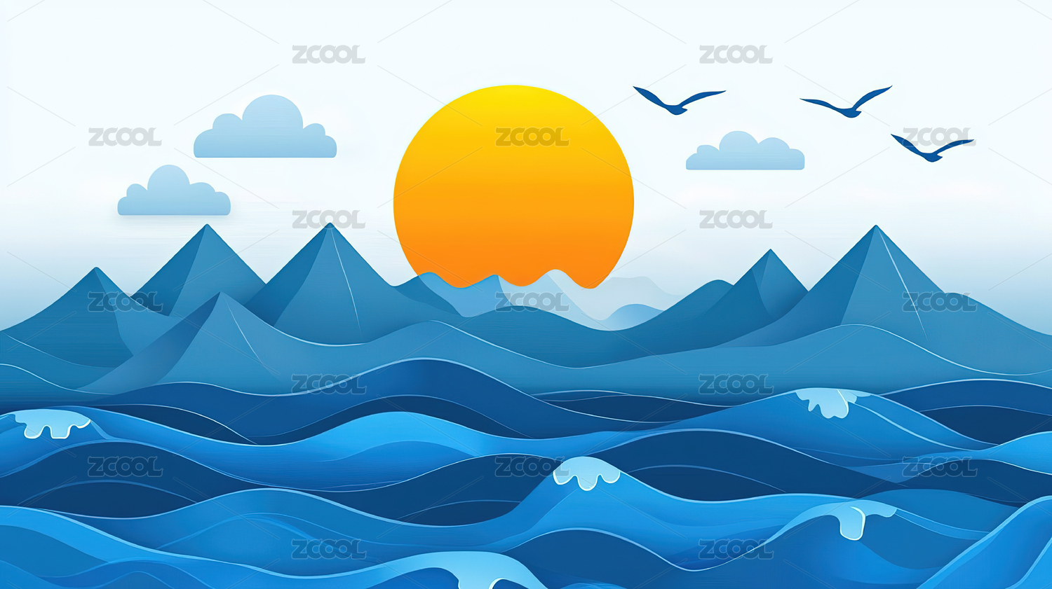 海浪翻涌纸艺风格,旭日东升色彩鲜明