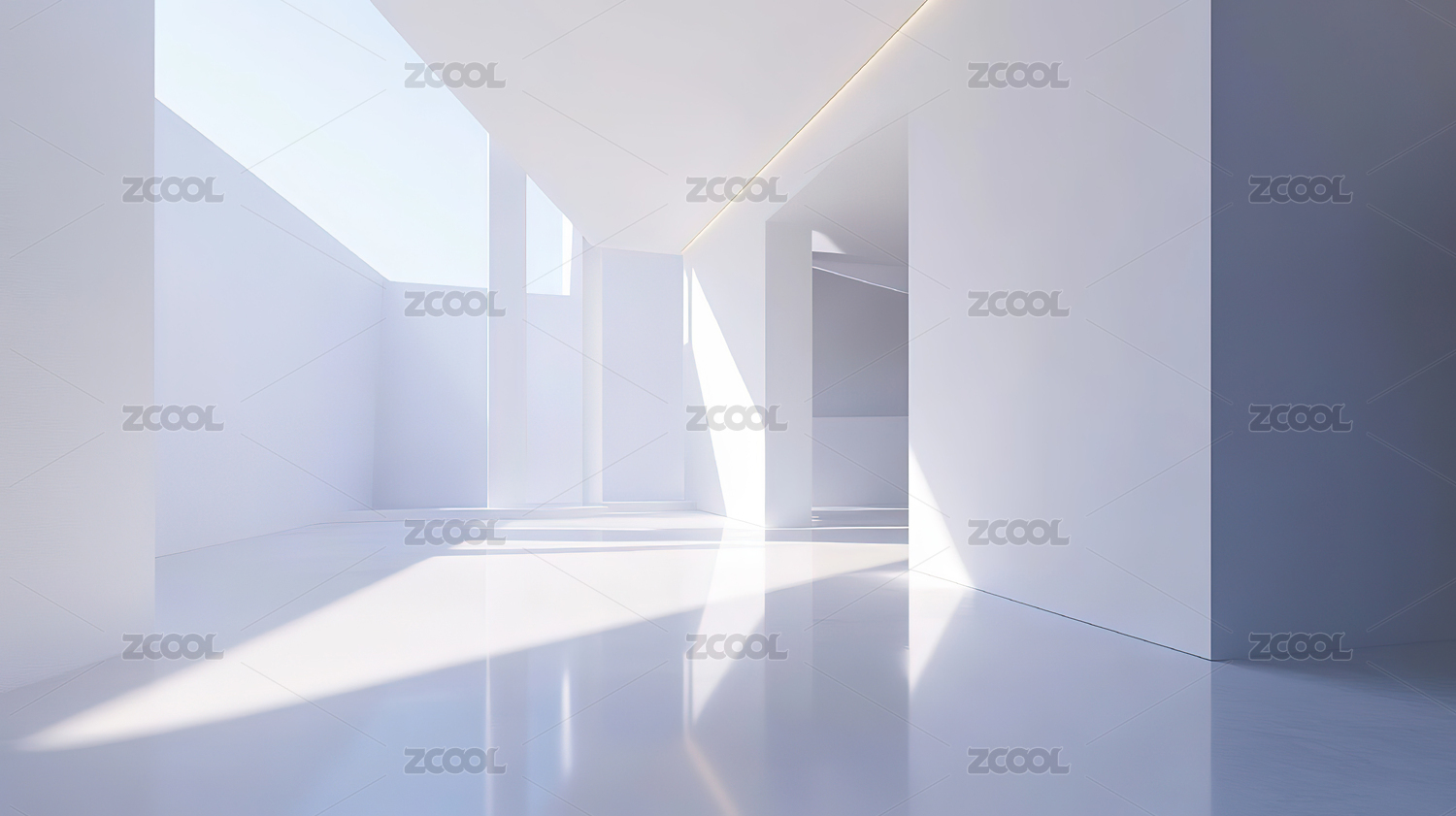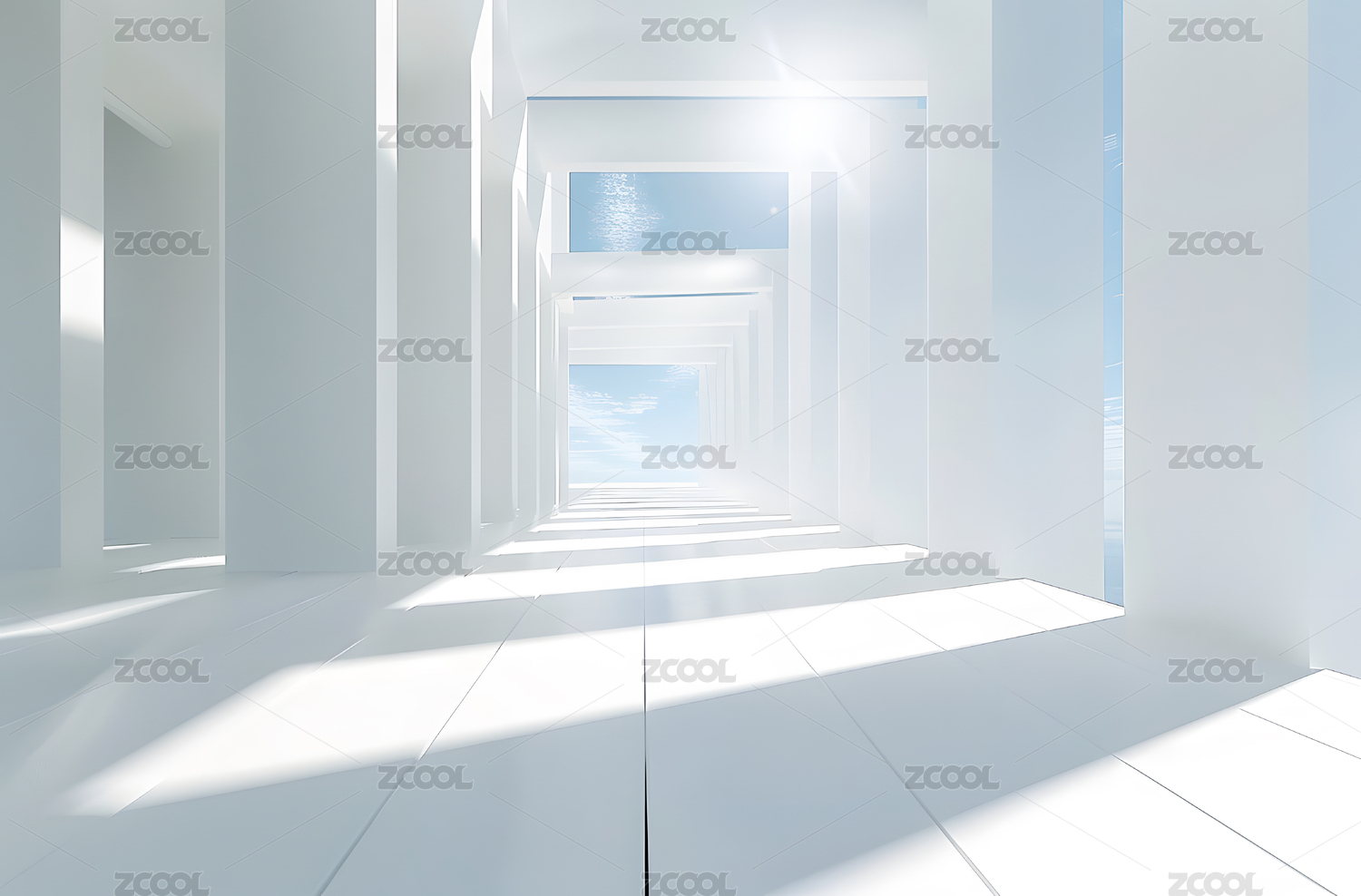 白色简洁有楼梯通往天台的室内空间3D渲染