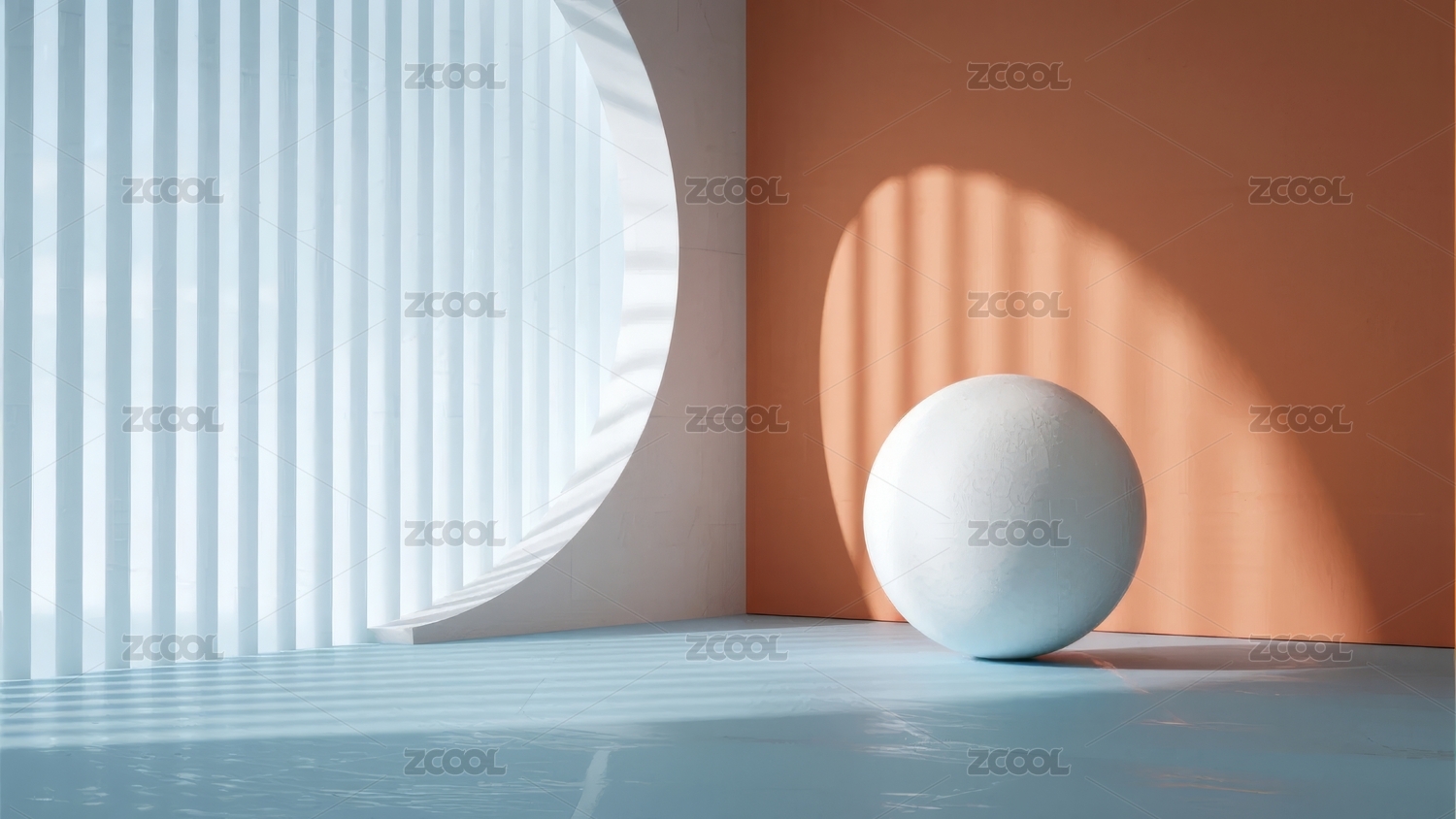 白色球体置于弧形窗边的光影场景