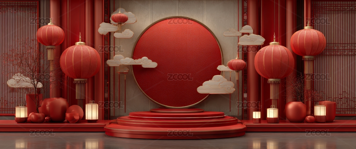 中式红背景节日展示场景图