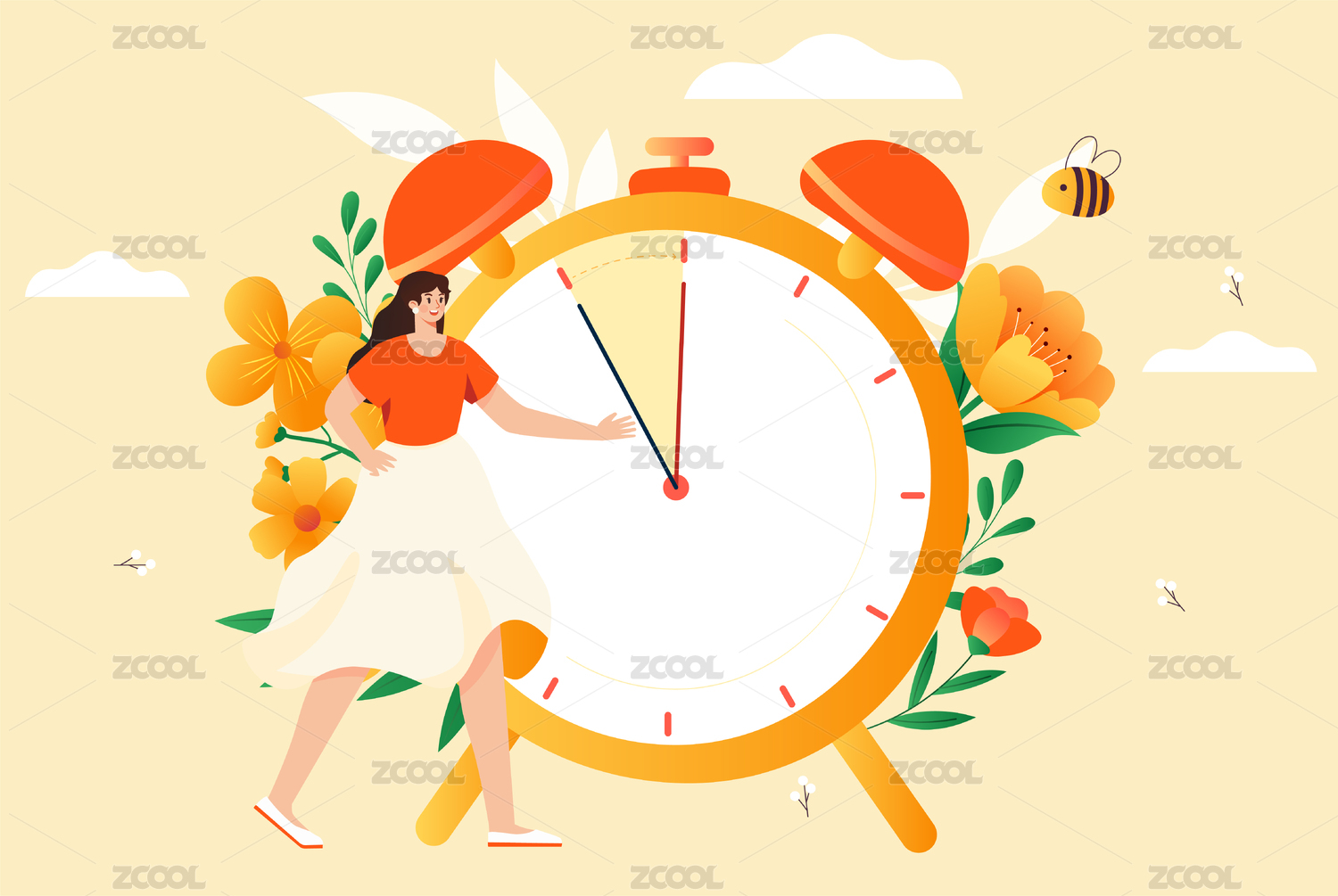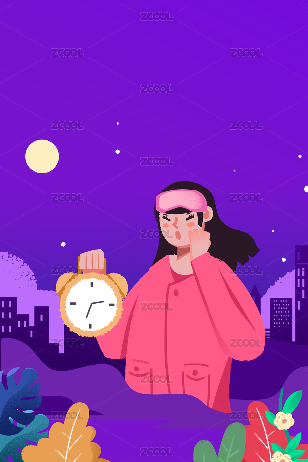 卡通手绘女子穿睡衣提着闹钟打呵欠插画
