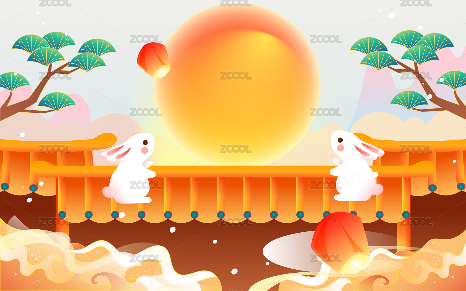 八月十五中秋节兔子屋顶赏月中国风国潮插画