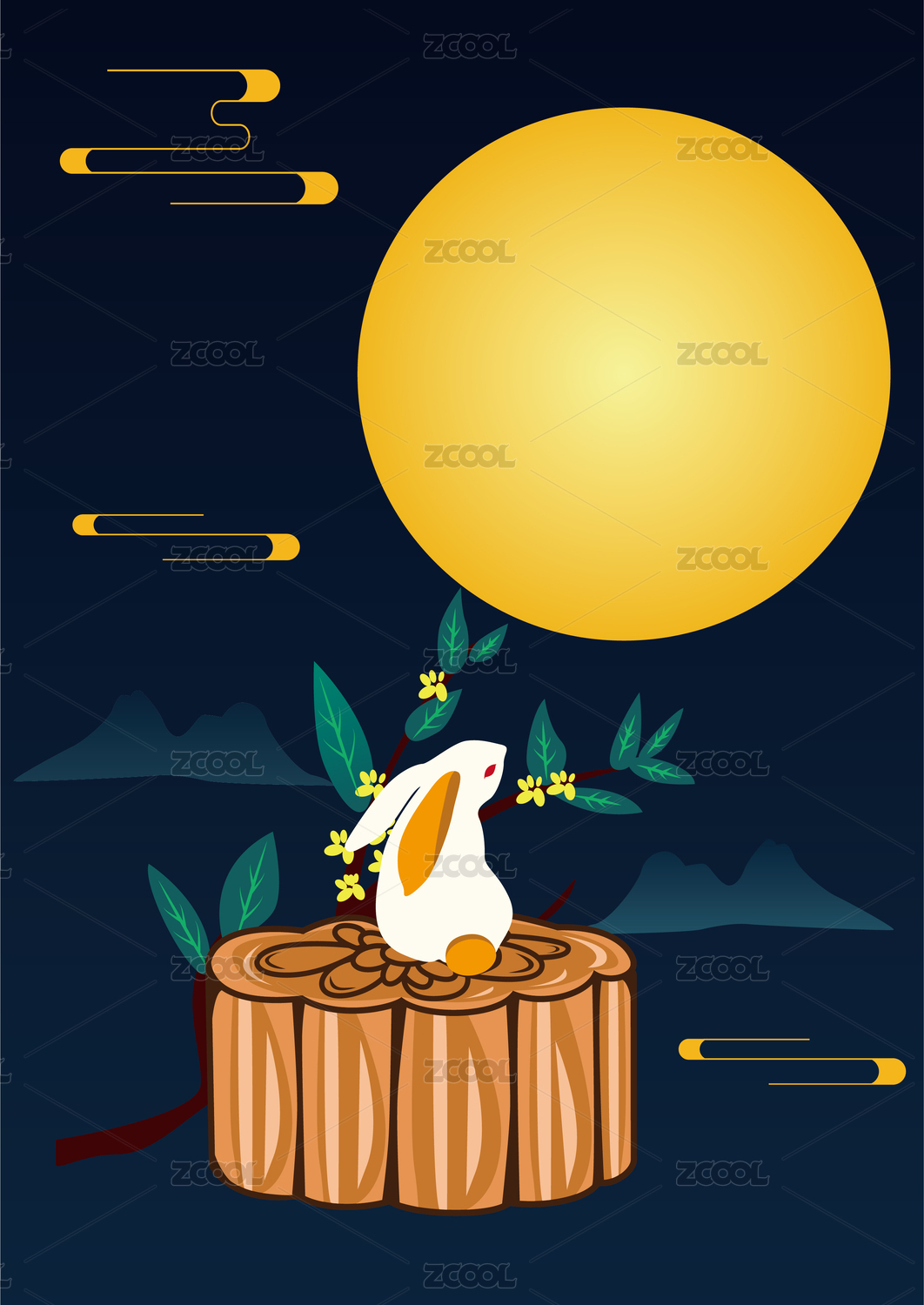 中秋节玉兔赏月吃月饼传统节日兔子望月插画