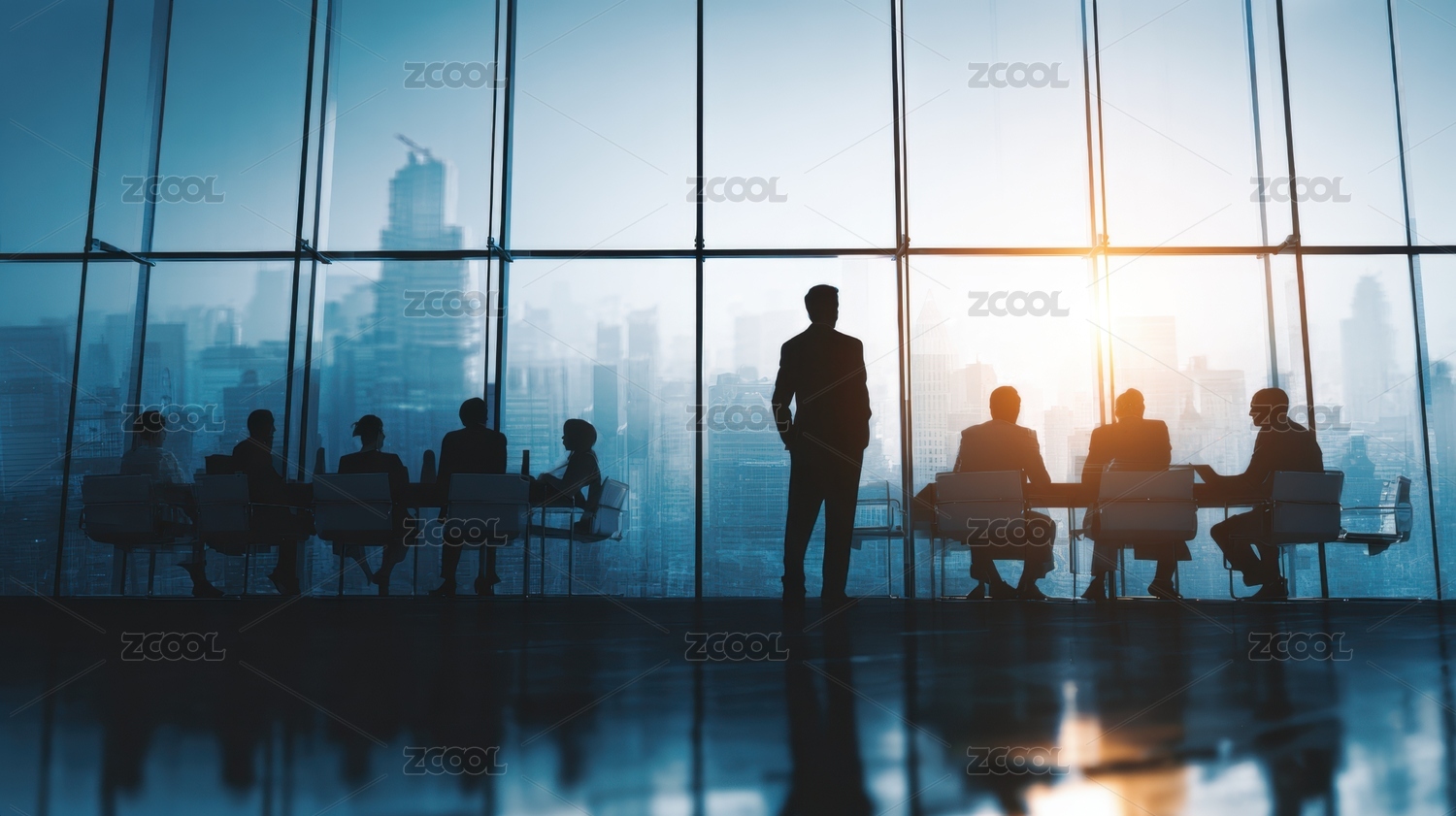 一位成功商业白领站在玻璃幕墙后边欣赏城市