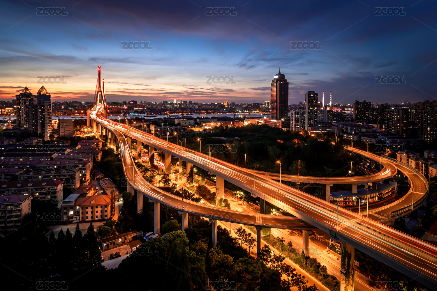 中国上海杨浦大桥台风天黄昏时候城市风光