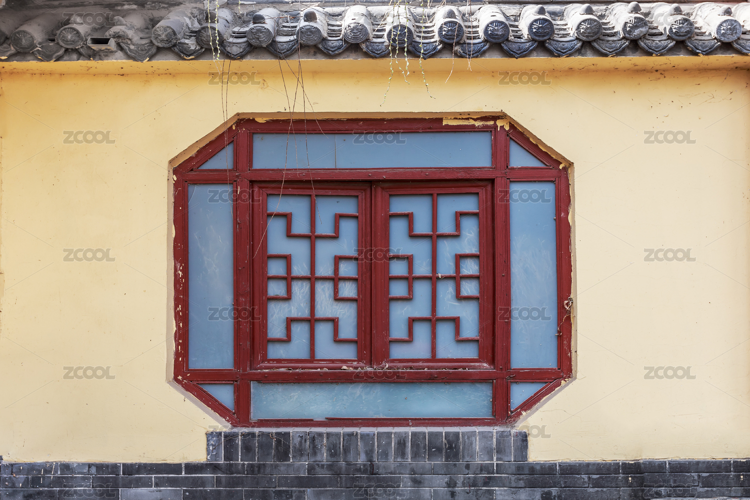 中国山东省淄博市临淄区姜太公祠内的灰瓦黄色墙墙面上的中式窗户