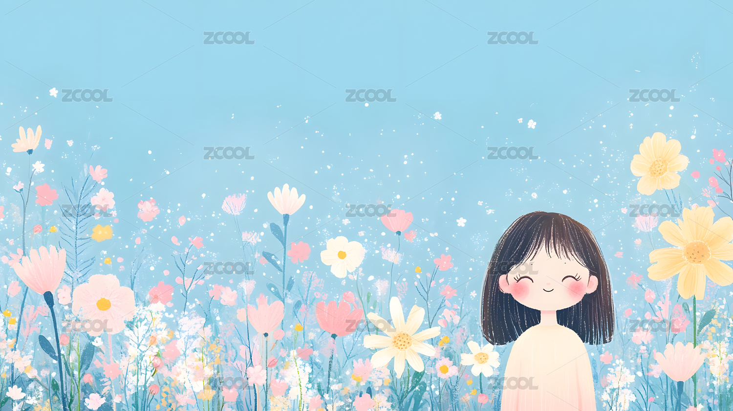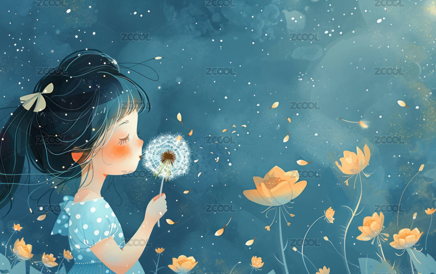 蓝色背景上一个吹着蒲公英的小女孩艺术插画