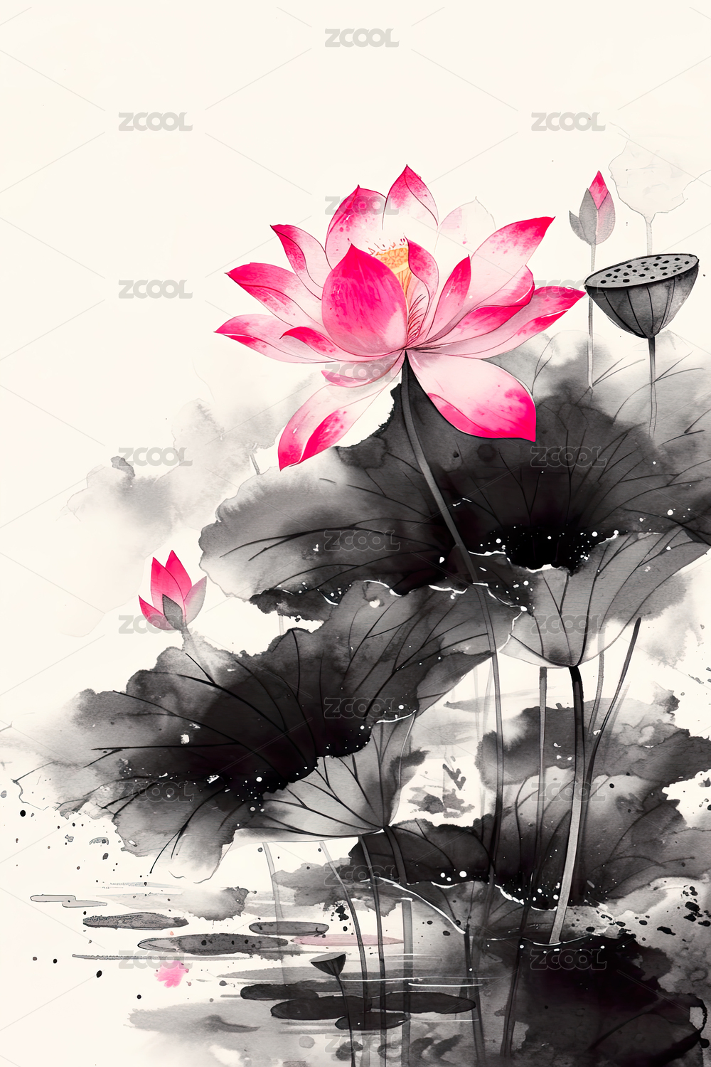 水墨风红荷与花苞