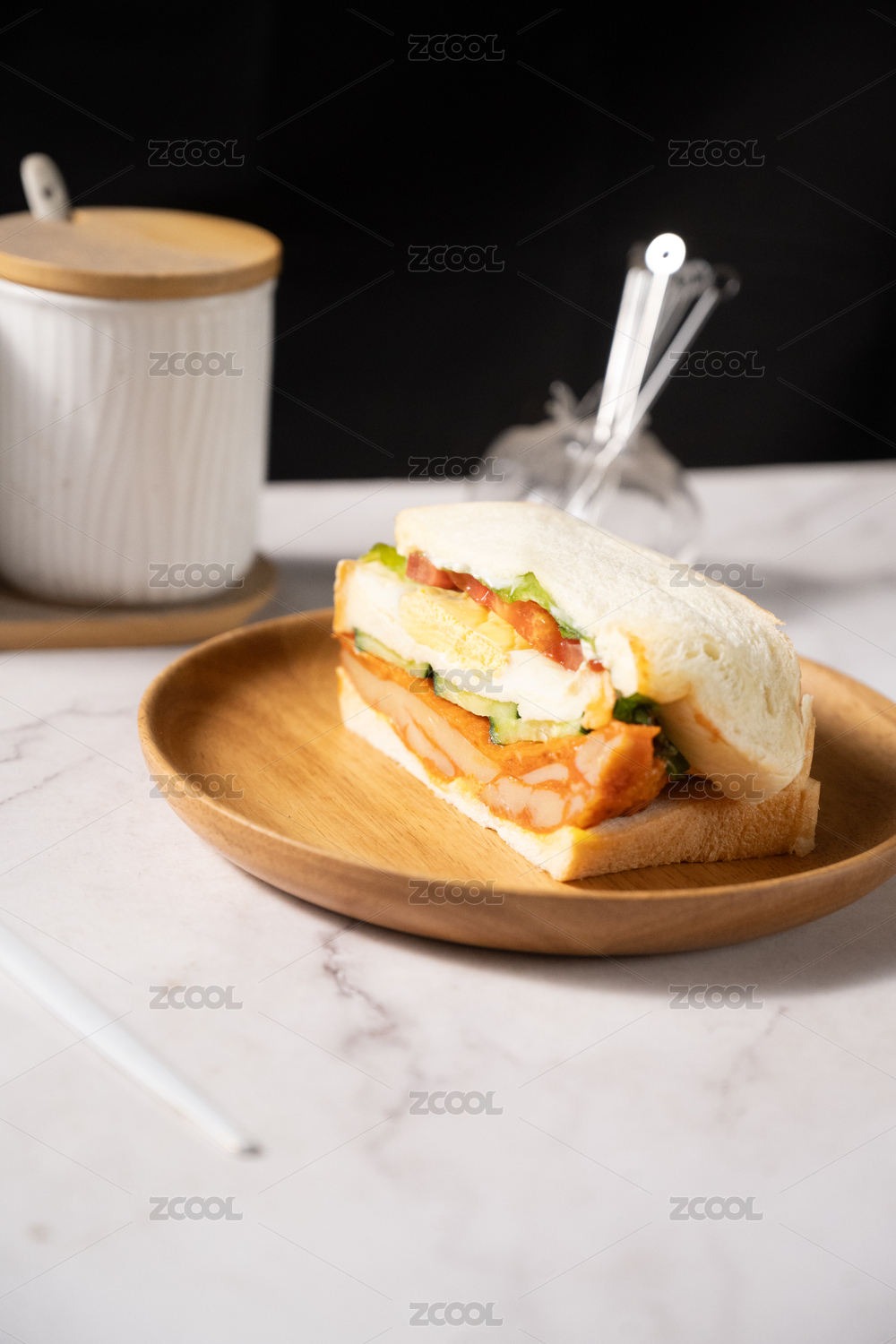 暗色木纹卓上放着一盘切开的三明治