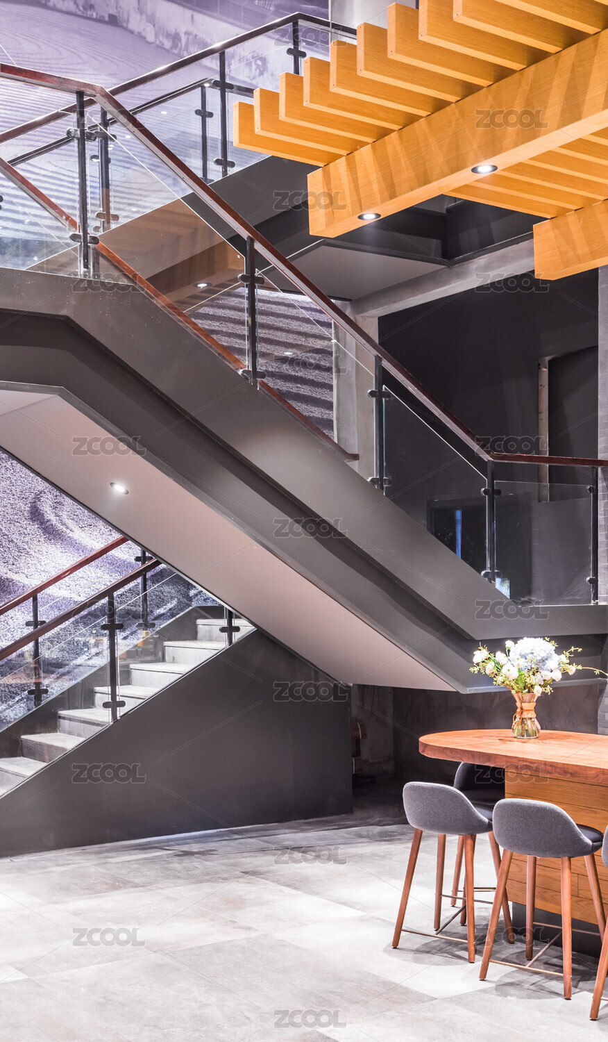 极简风格室内装修落地窗户旁边的木地板楼梯