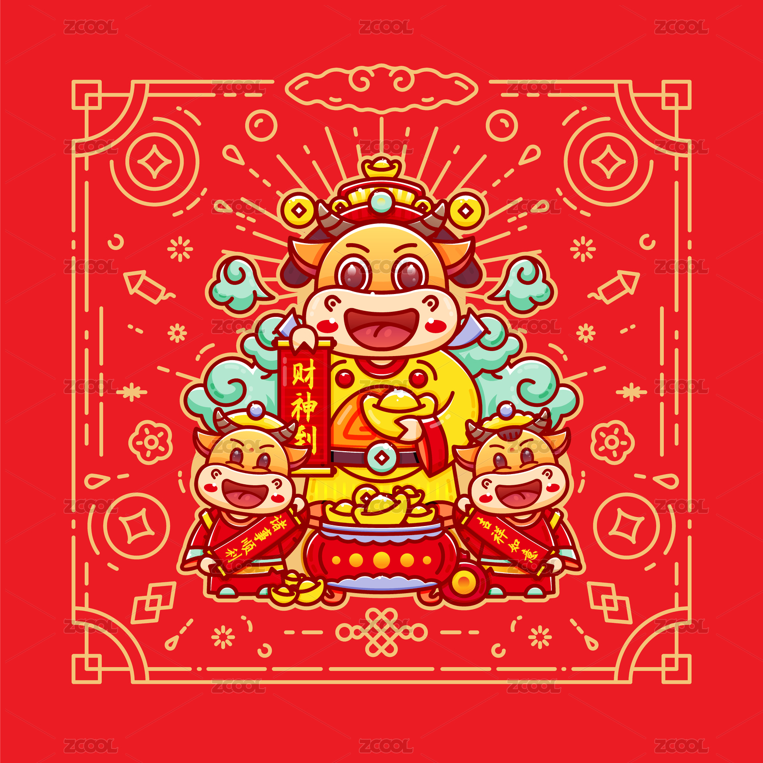 2021牛年春节财神主题矢量插画
