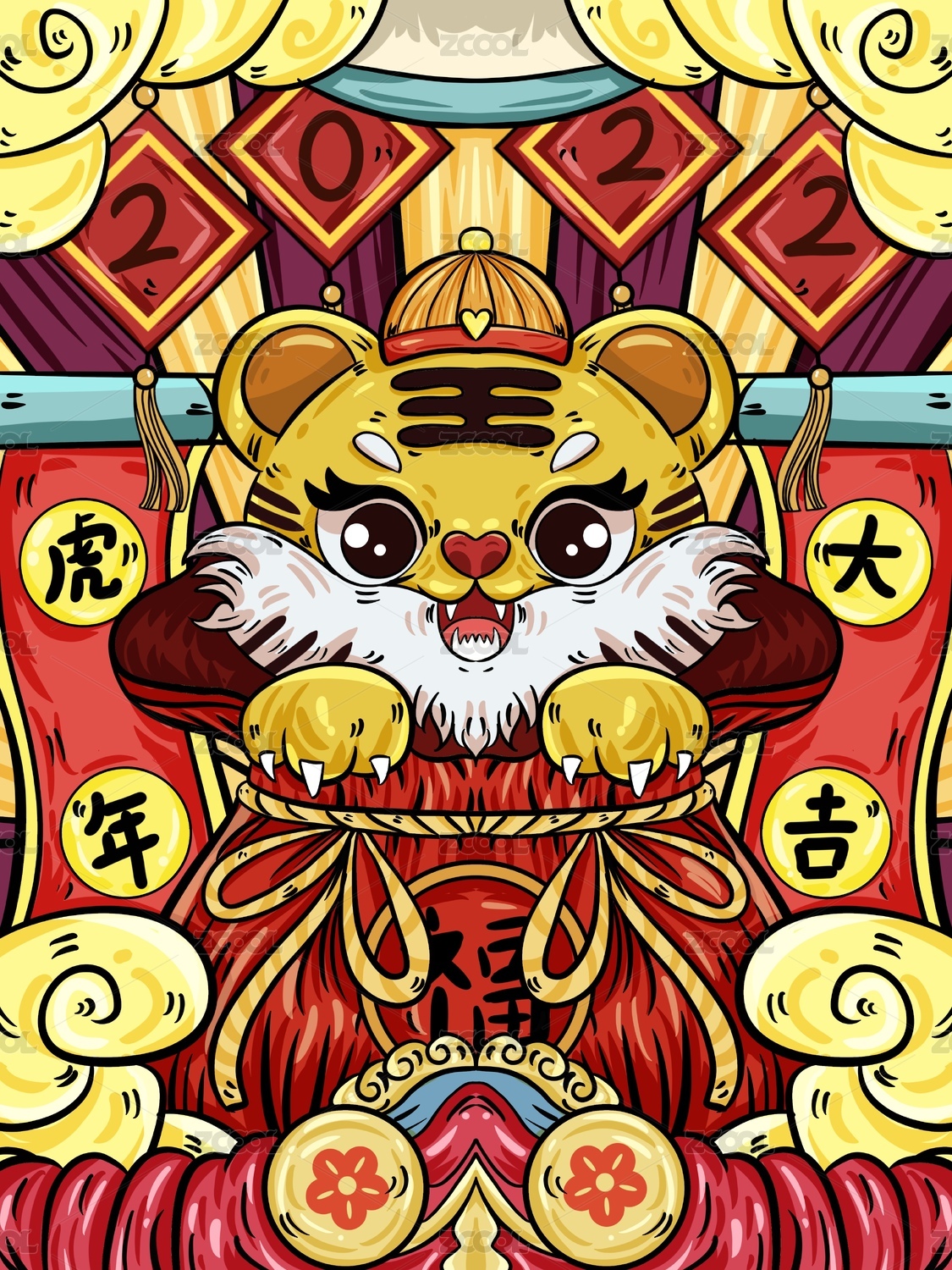 2022虎年新年可爱小老虎手绘国潮插画