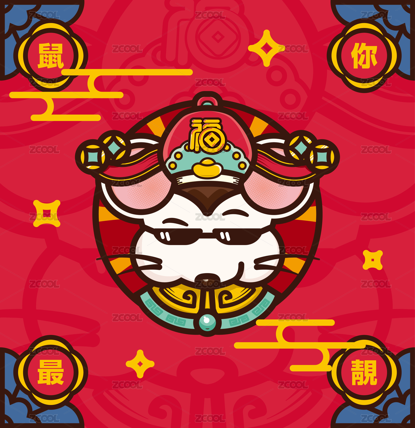 鼠年,红蓝,插画,图形,动物,鼠,艺术,红包,眼镜,元宝