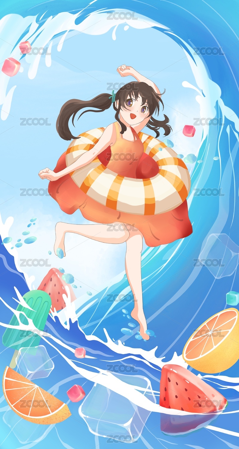 夏日海浪里游泳的女孩清新原创手绘插画