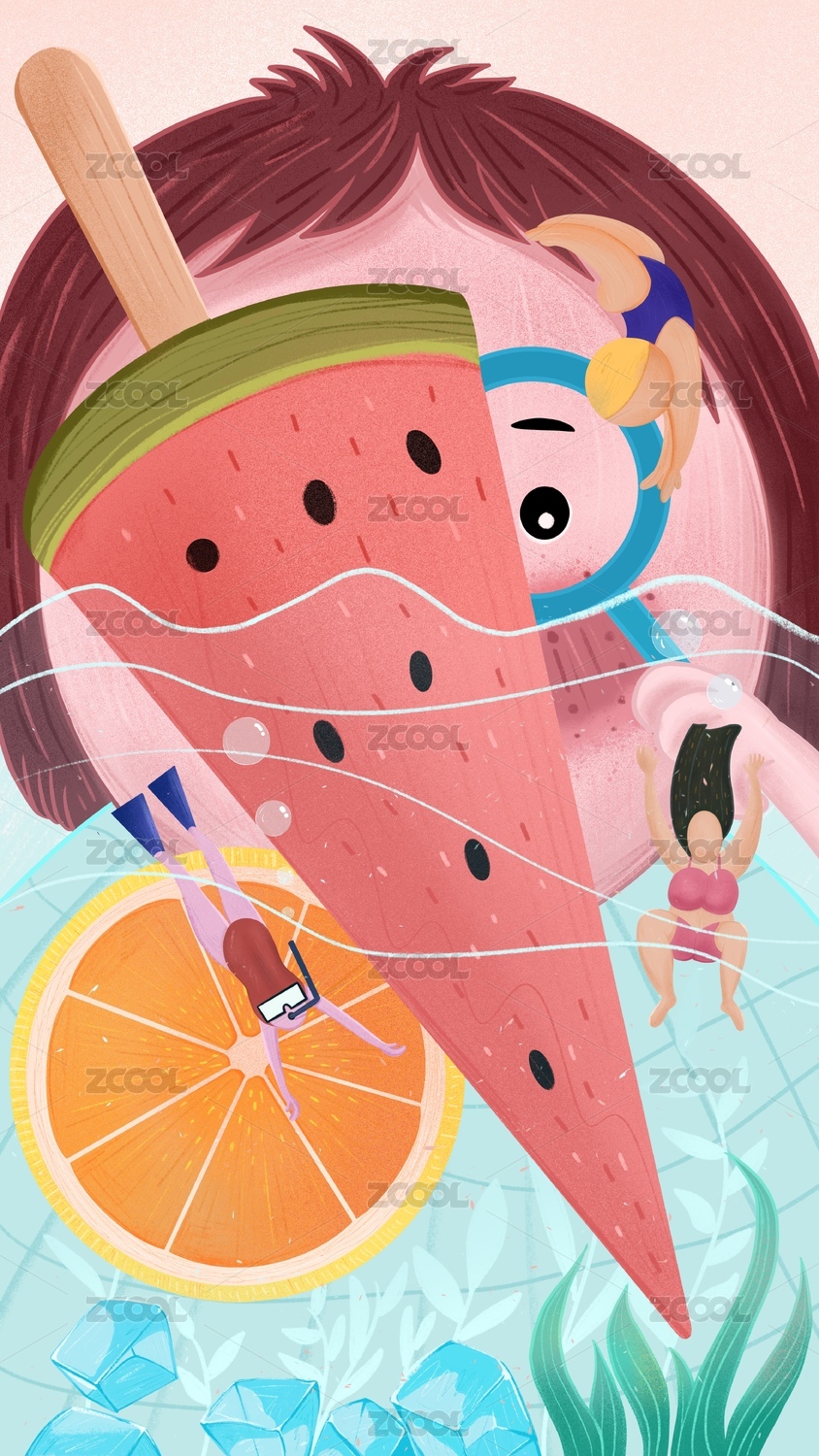 西瓜清凉泳池分层矢量插画