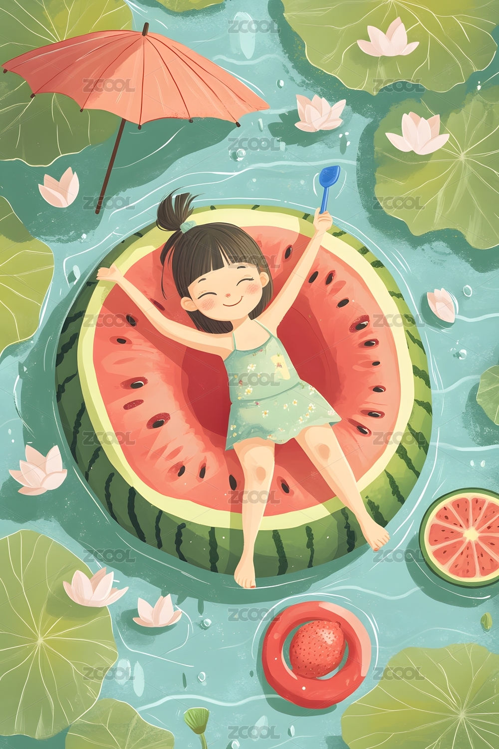 夏至节气 把荷叶当做伞身穿西瓜裙子的女孩