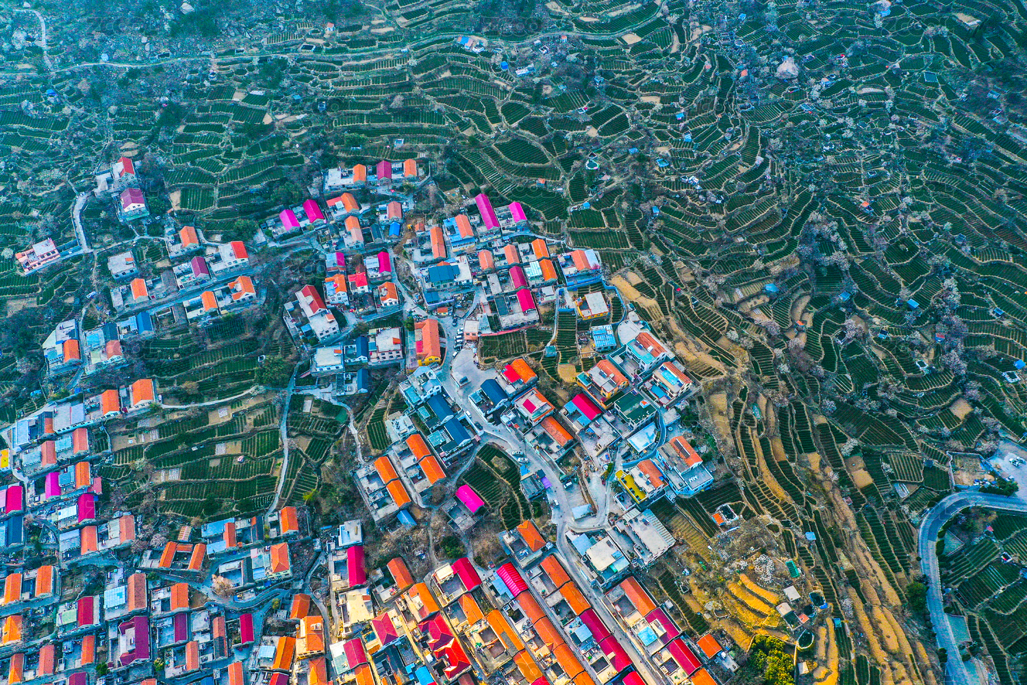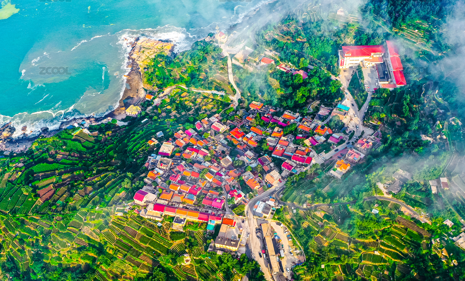 航拍视角,崂山,雕龙嘴,渔村,村子,山村,茶园,茶叶,海岸线,绿色