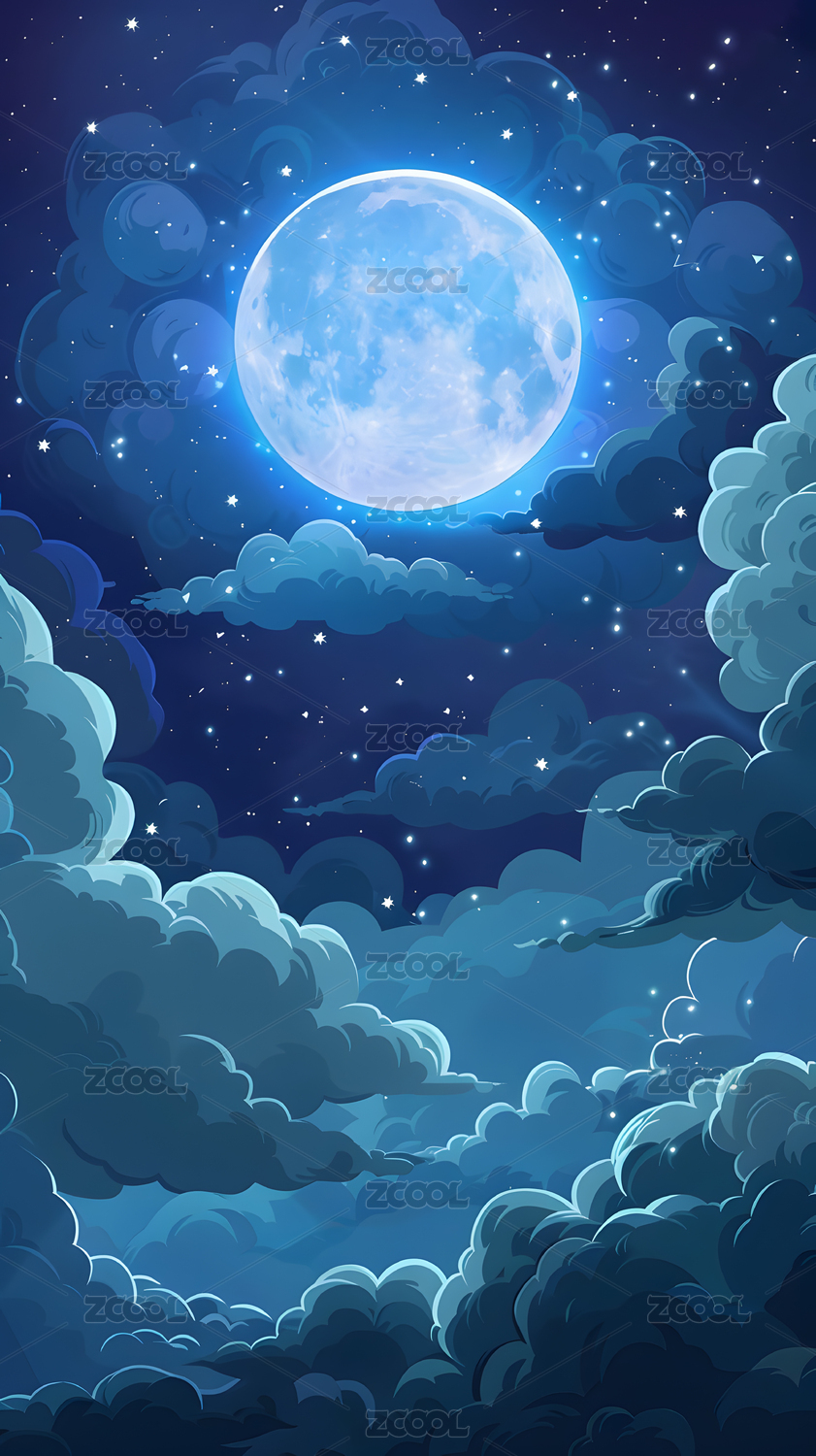 唯美,夜晚,壁纸,满月,星空,插画,云层,意境