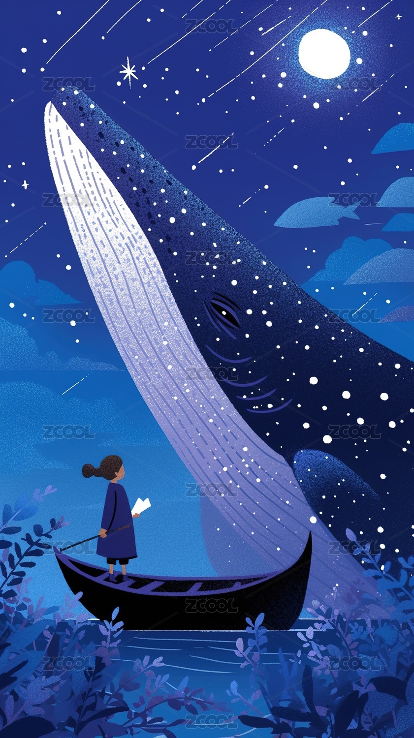 夜晚有光环的人和飞鱼 超现实插画壁纸