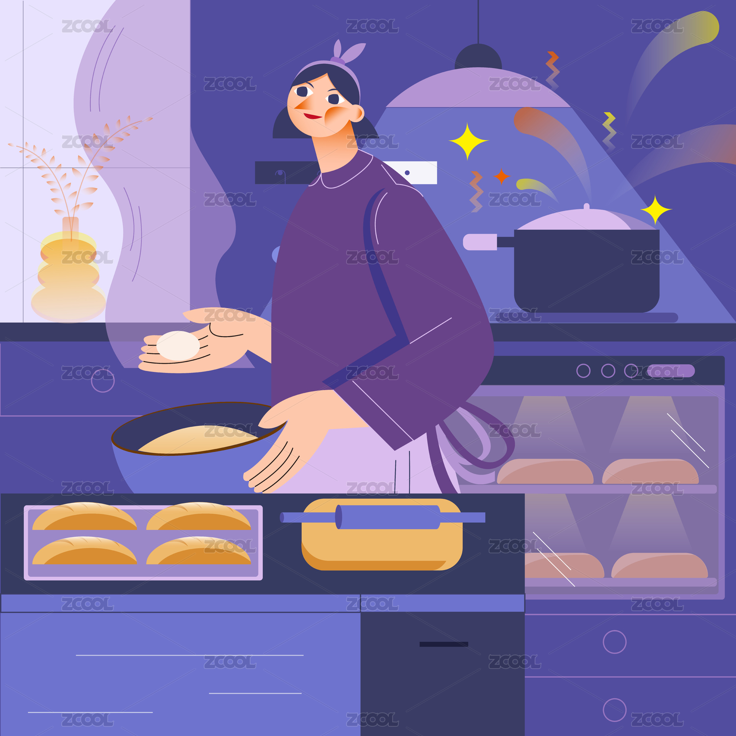 情侣厨房一起做饭烹饪美食健康餐饮饮食插画