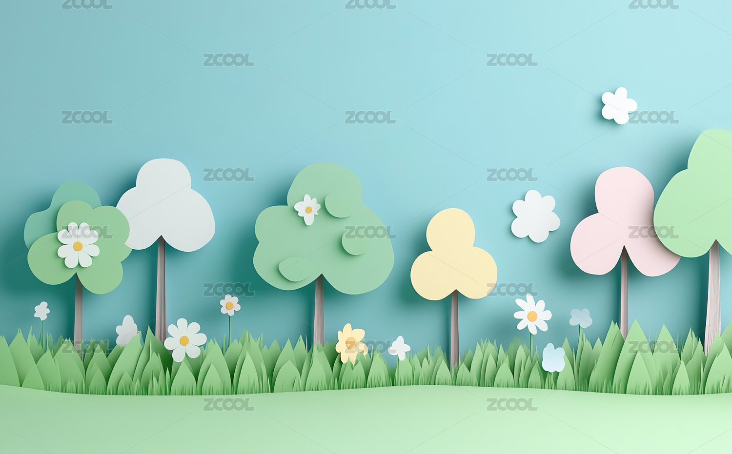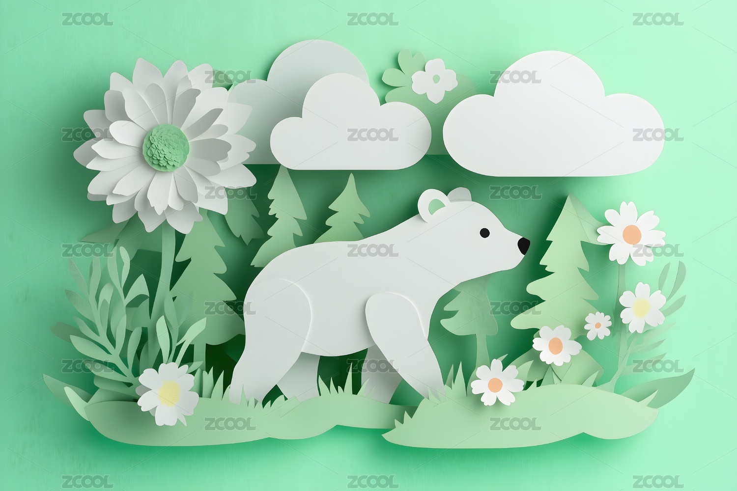 小熊,可爱的,剪纸,可通,3D,丛林,白云,花朵
