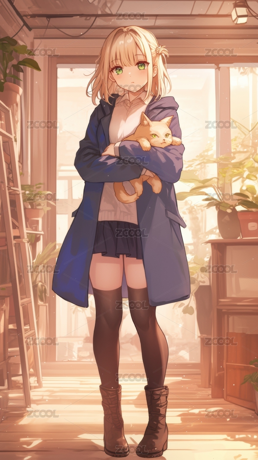 室内阳光下抱着猫咪的女孩