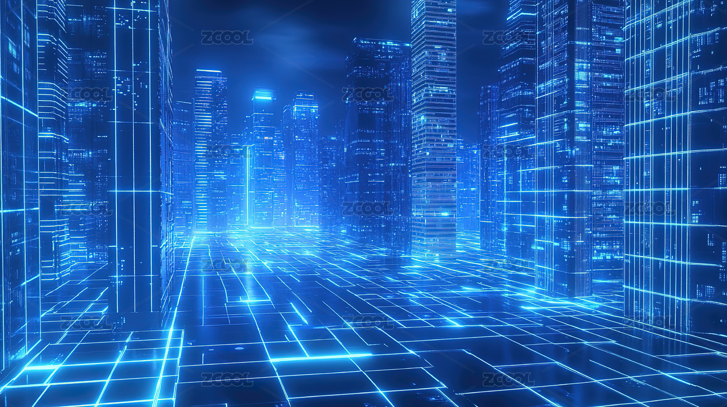 未来都市,夜景,摩天大楼,灯光,蓝色线条,网格,科技感,数字时代,信息流,未来气息