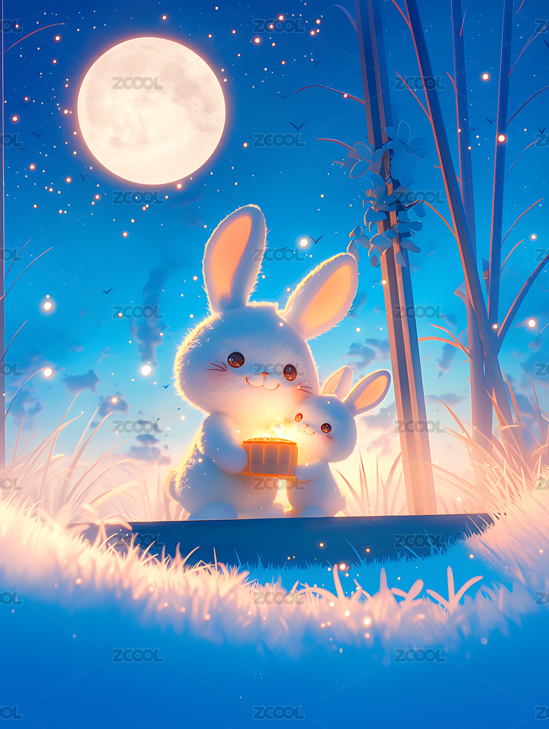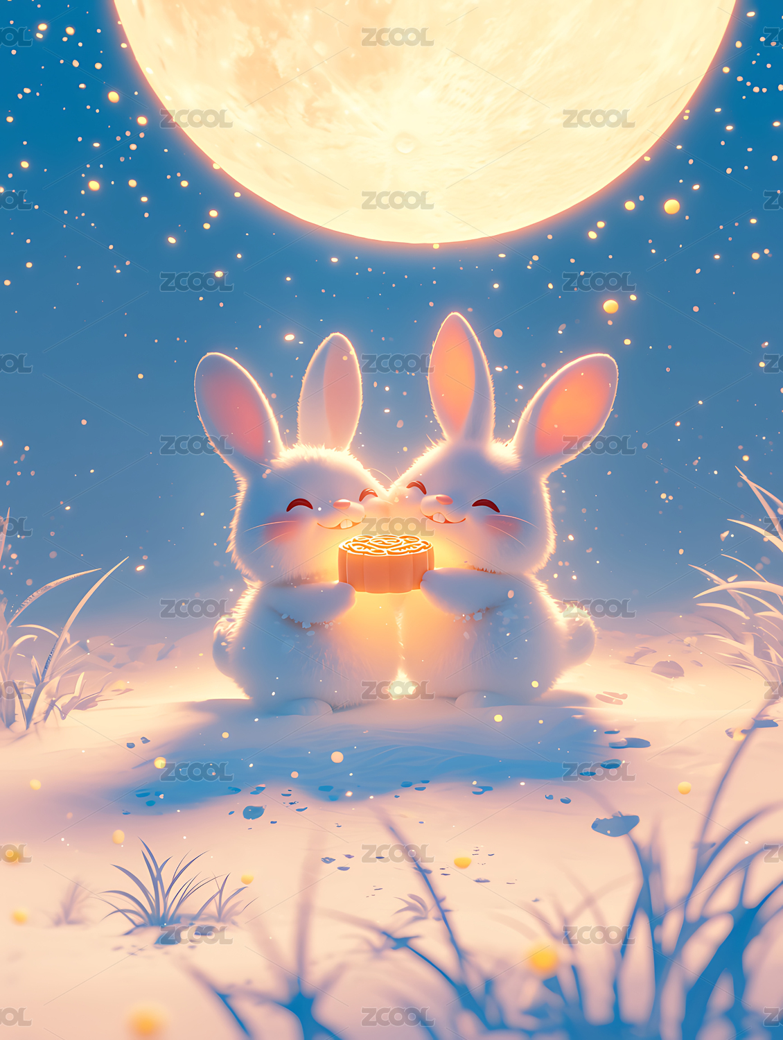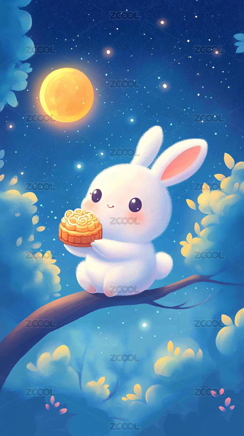 中秋节月亮玉兔抱着月饼赏月场景概念插图