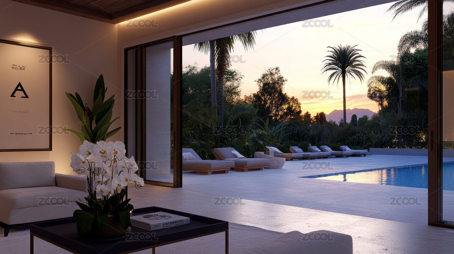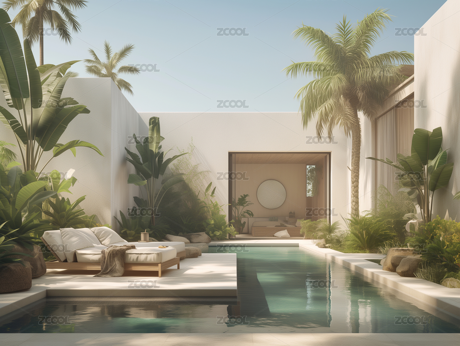 户外,露台,休息区,游泳池,热带,植物,家具,沙发,咖啡桌,地毯