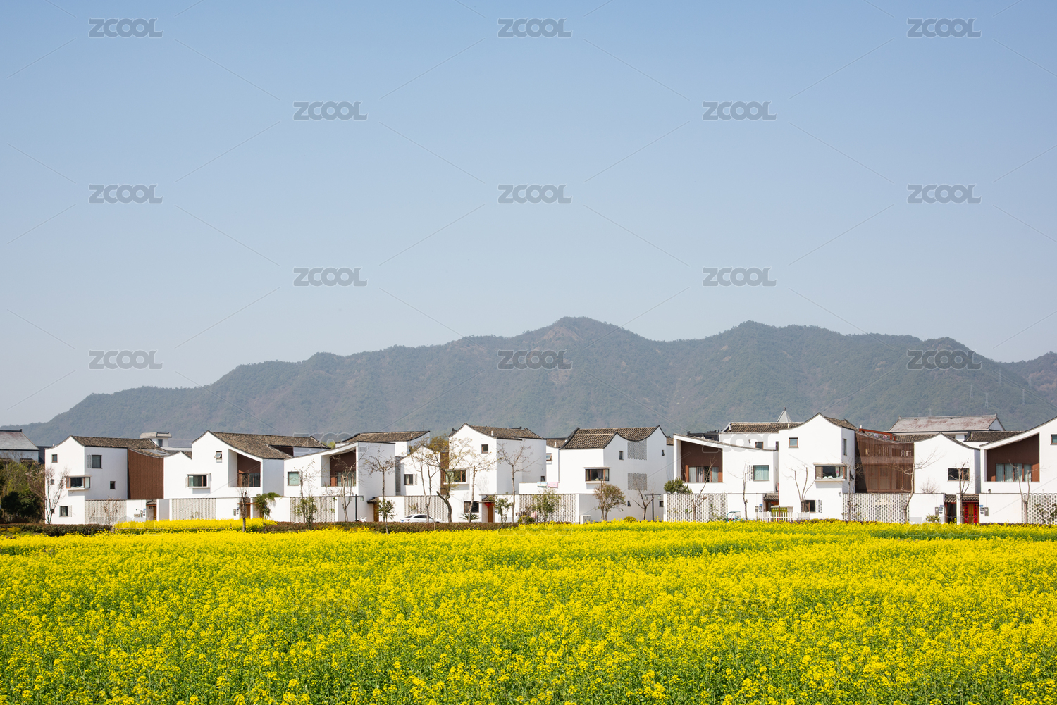 浙江杭州富阳东梓关油菜花田中的现代新农村