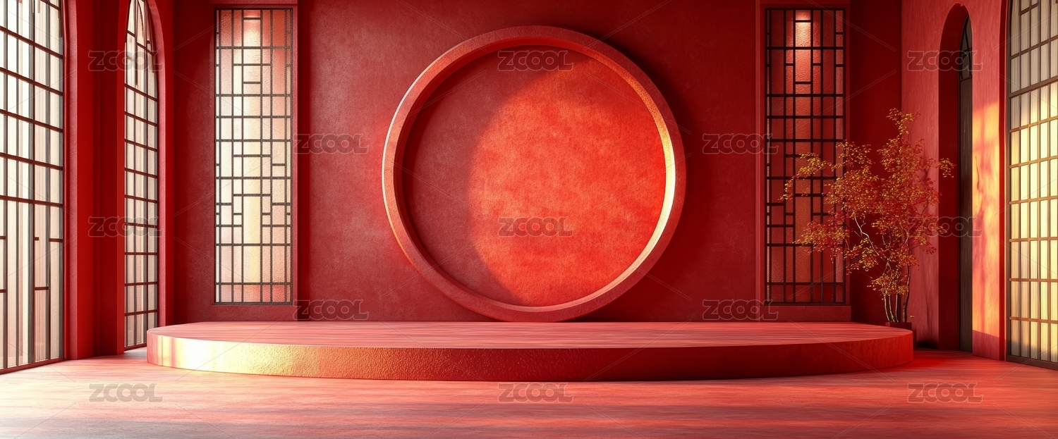 红色背景中式圆窗