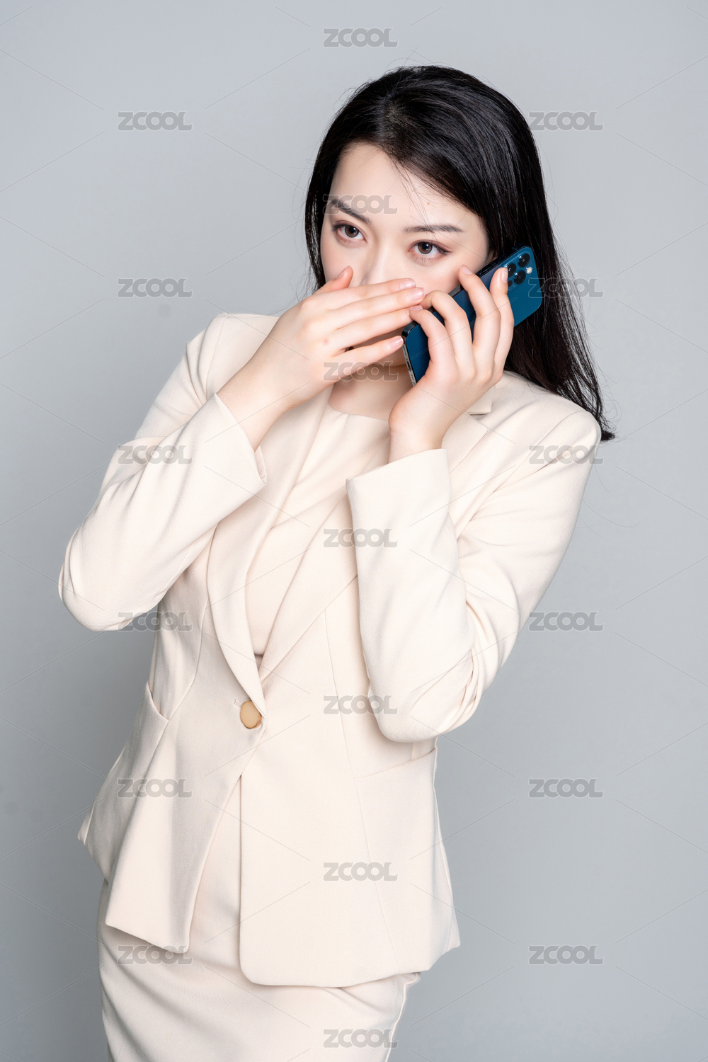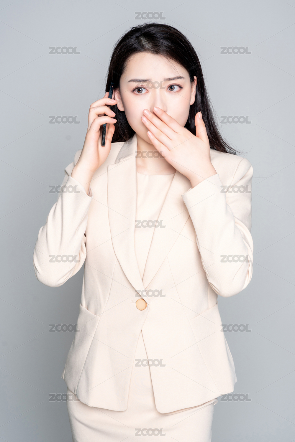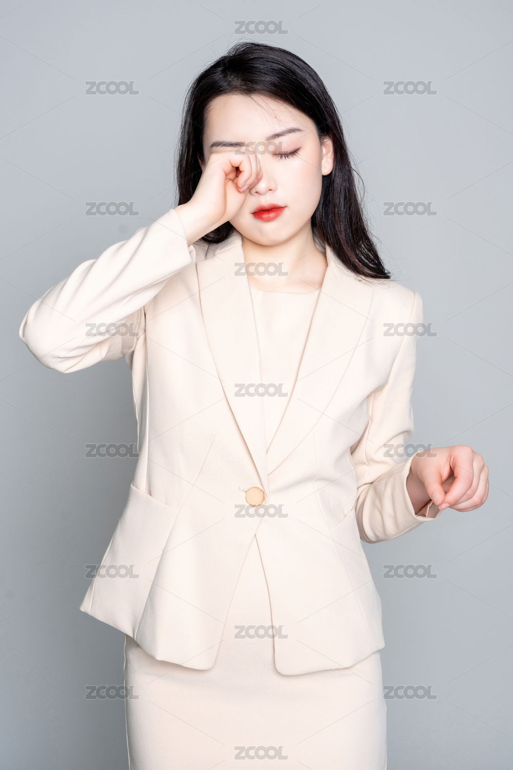 灰色背景里,身穿西服的美丽商务女士