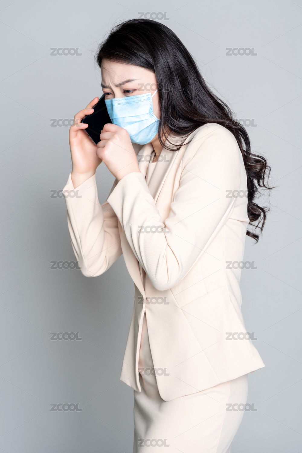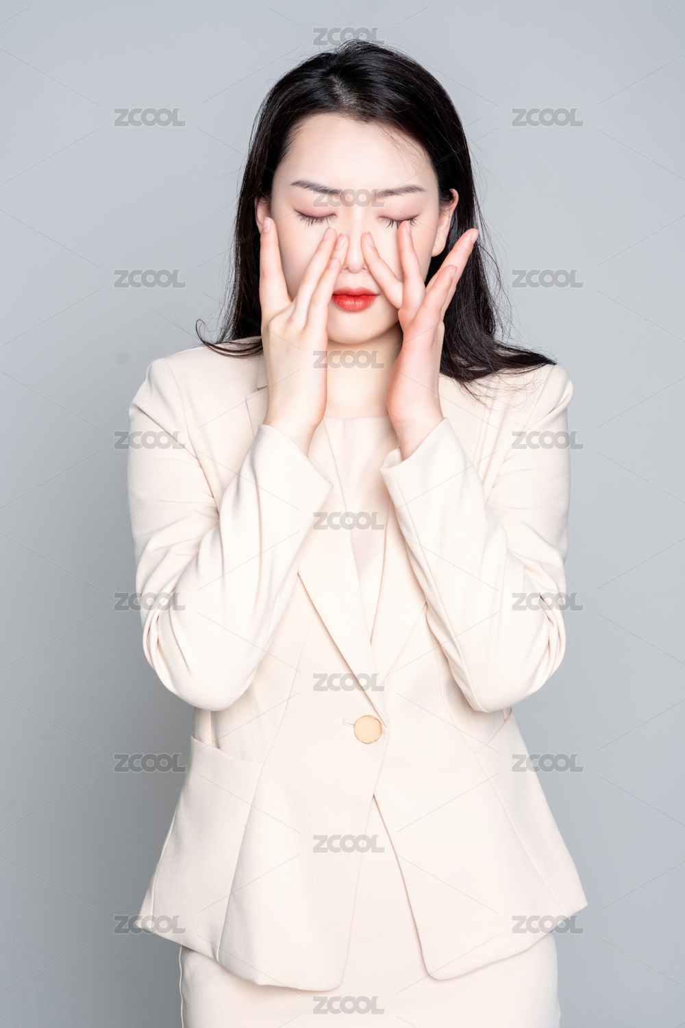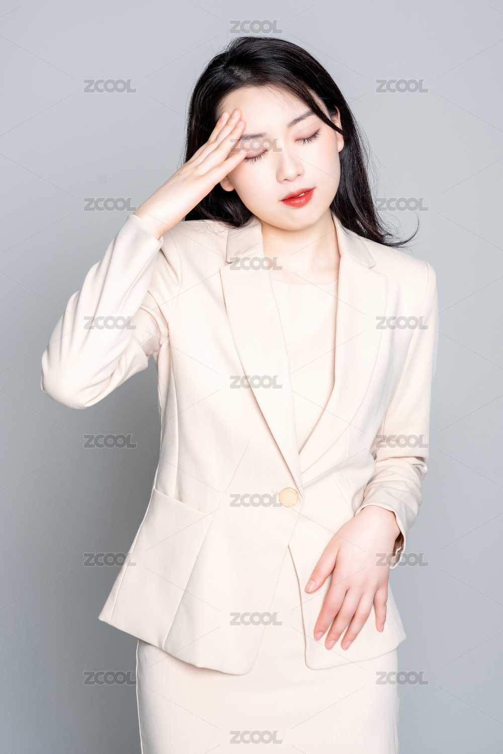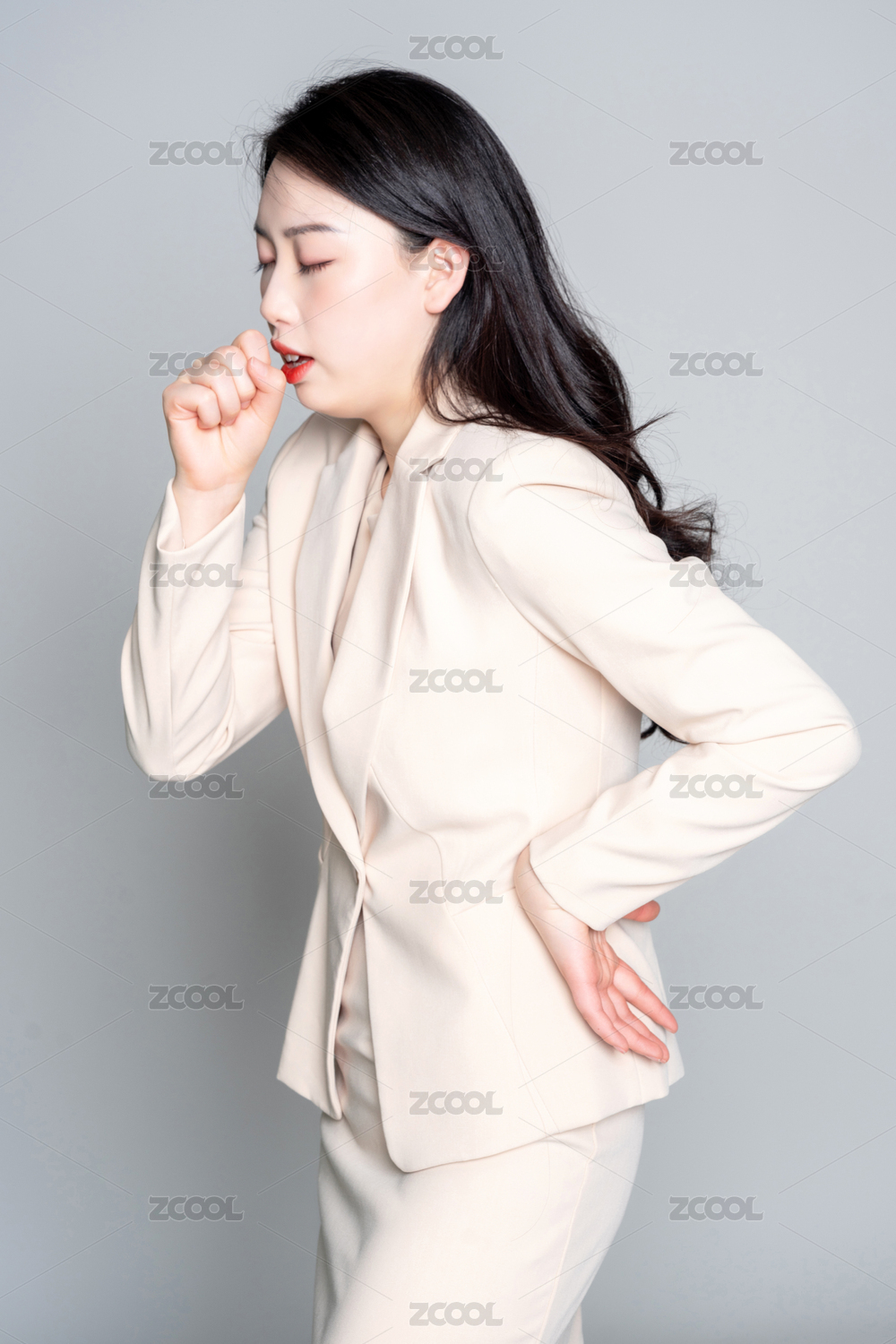 白色背景里,身穿西服身体不舒服的美丽商务女士