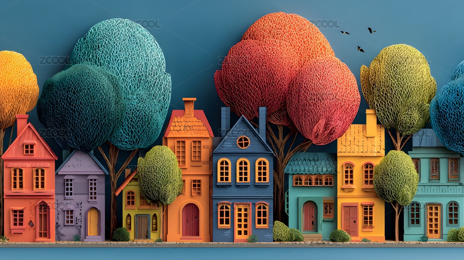 童话小镇彩色房子与毛绒树木