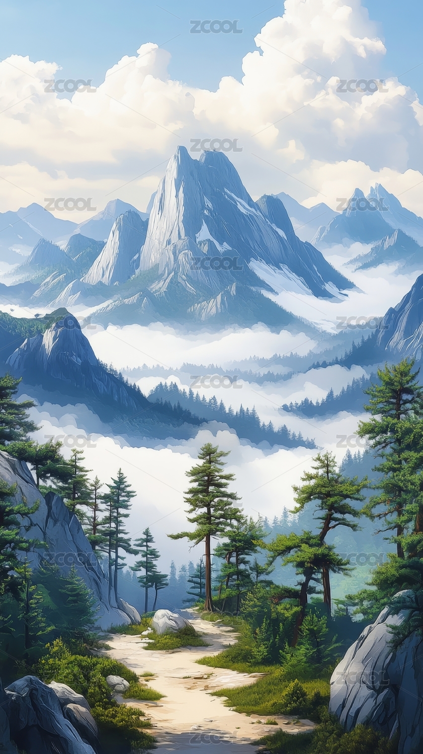 中国风,彩色,山水,风景,艺术,云雾,植物,插画