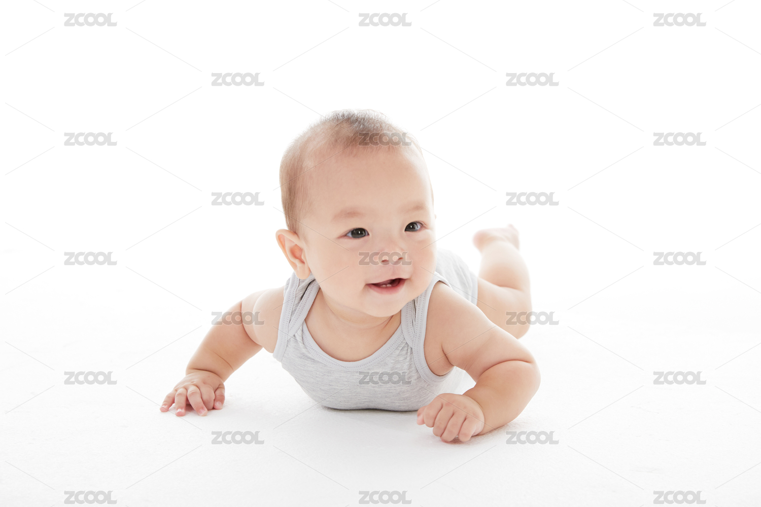 婴儿宝宝趴在地上开心玩抬头看镜头