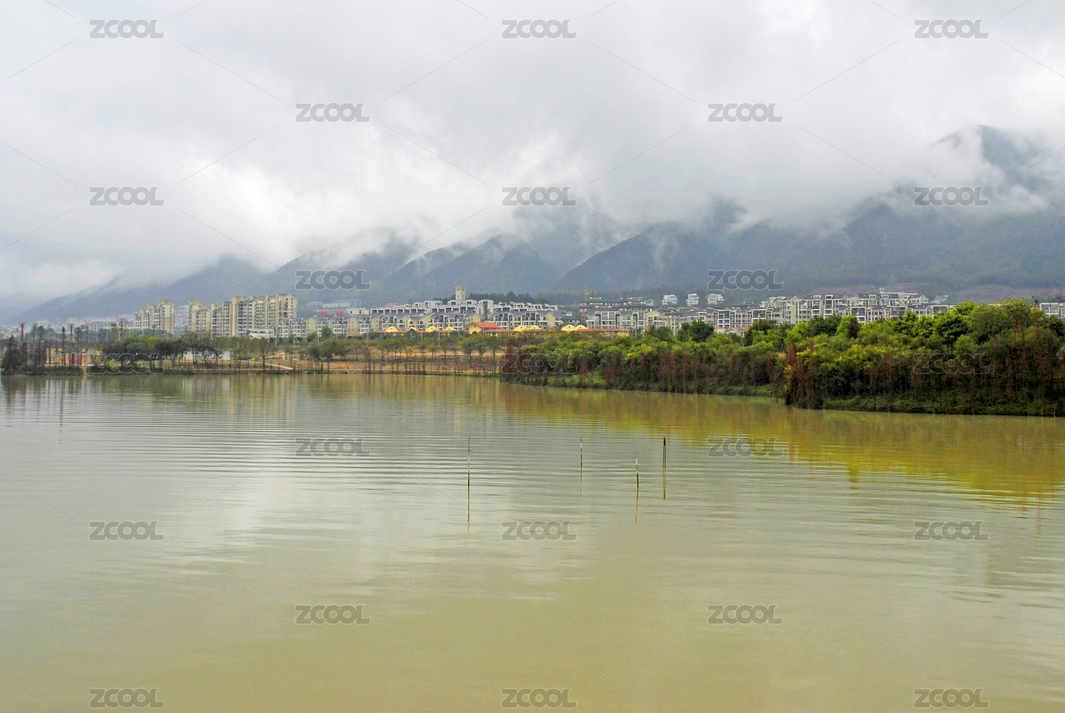 昆明滇池蓝天彩云晚霞山脉城市楼群自然景观