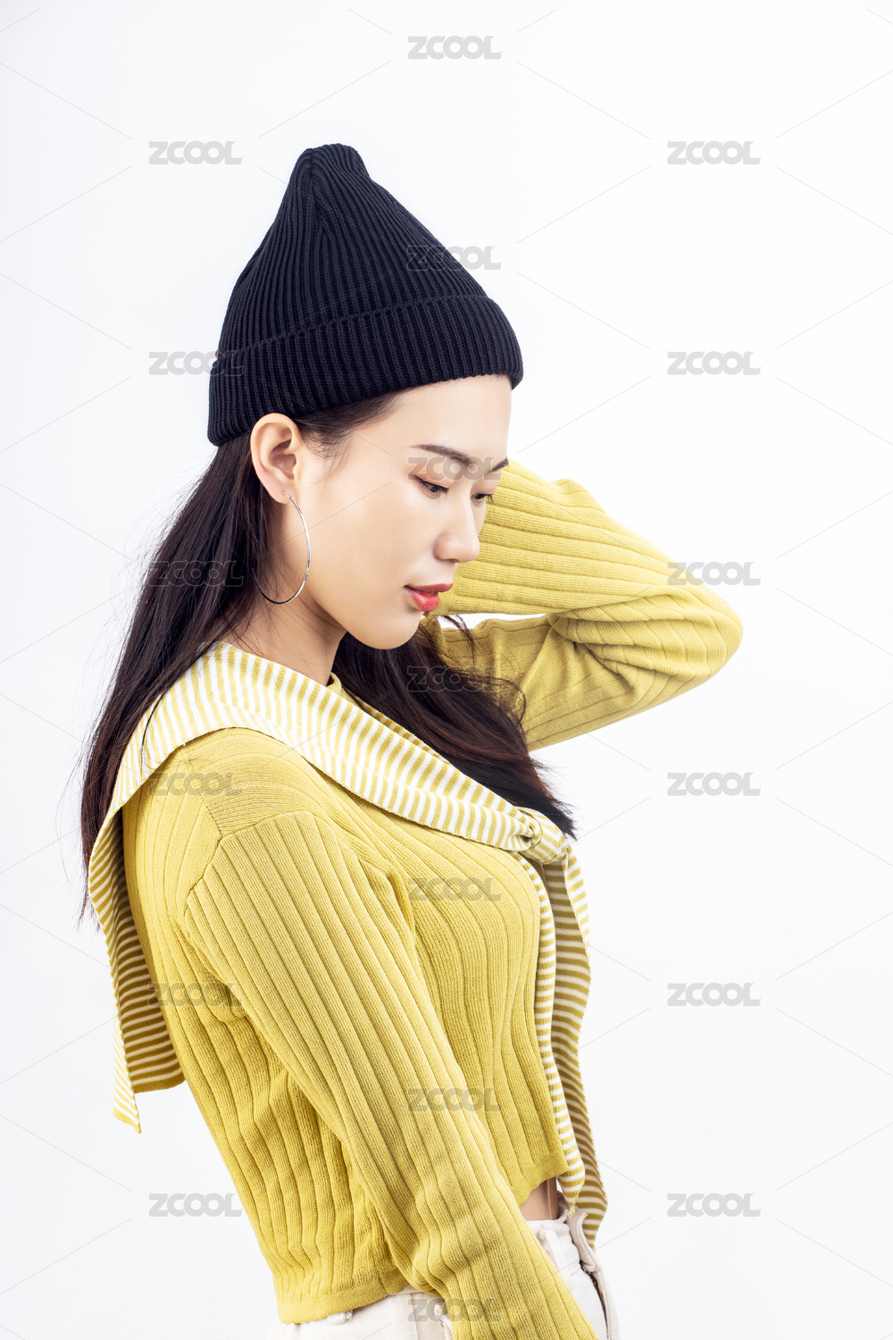 年轻女生双手拉帽子