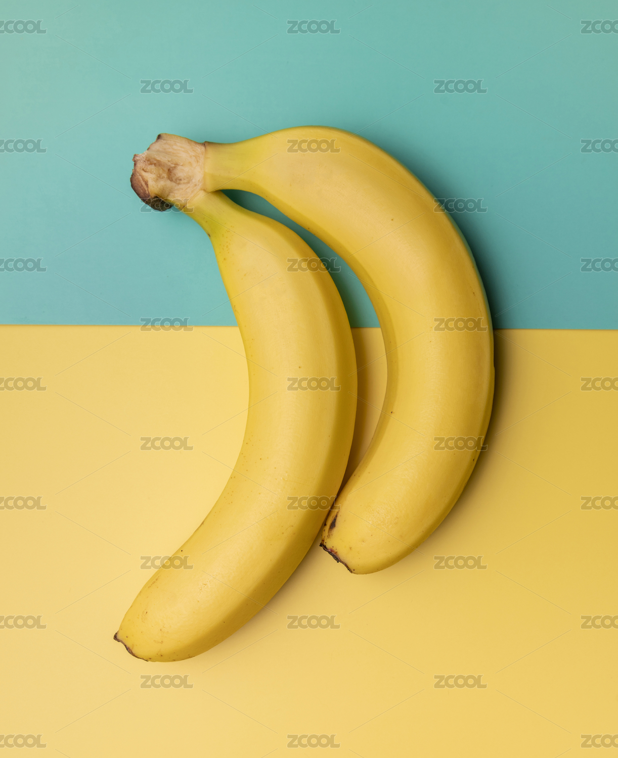 俯拍黄色绿色撞色背景水果特写——香蕉